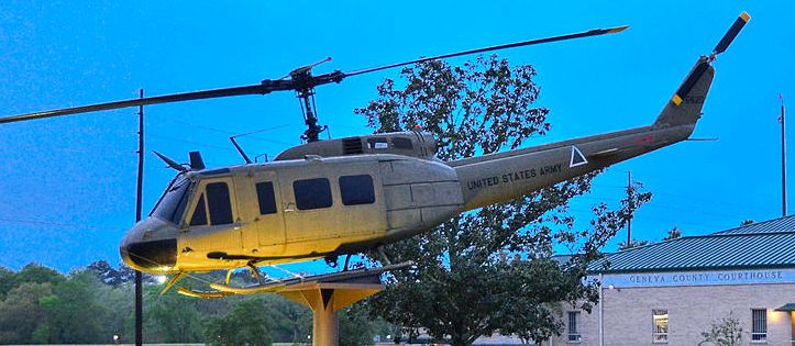 Bell UH-1H Iroquois Helicopter (Serial No. 69-6620).  This helicopter is mounted on a pylon beside the Geneva County Courthouse.