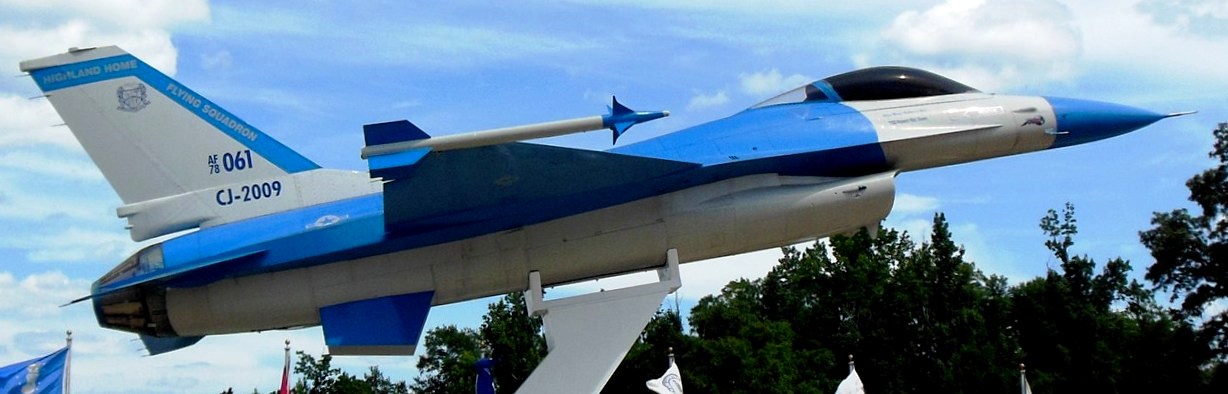 General Dynamics F-16A Fighting Falcon (Serial No. 78-0061), CJ-2009, C/N 61-57.  This former Air National Guard fighter is mounted on a pylon at the entrance to Highland Home High School in the school’s colours.