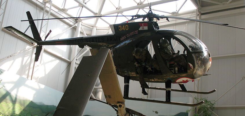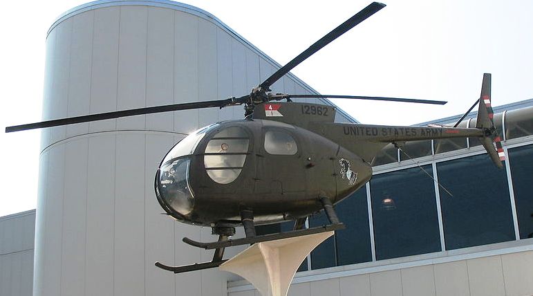 Prototype Hughes OH-6A Cayuse Helicopter (Serial No. 65-12962), mounted on a pylon in front of the museum.