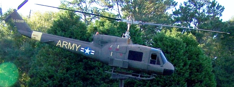 Bell UH-1C Iroquois Helicopter (Serial No. 0-22099), mounted on a pylon located inside the Fort Rucker gate on AL Highway 249.