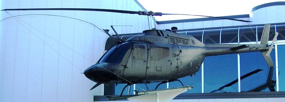 Bell OH-58C Kiowa Helicopter (Serial No. 70-16734), c/n 40048, mounted on a pylon in front of the museum. The OH-58C had uprated engines and an exhaust mounted IR suppression system. It also had a larger dashboard panel.