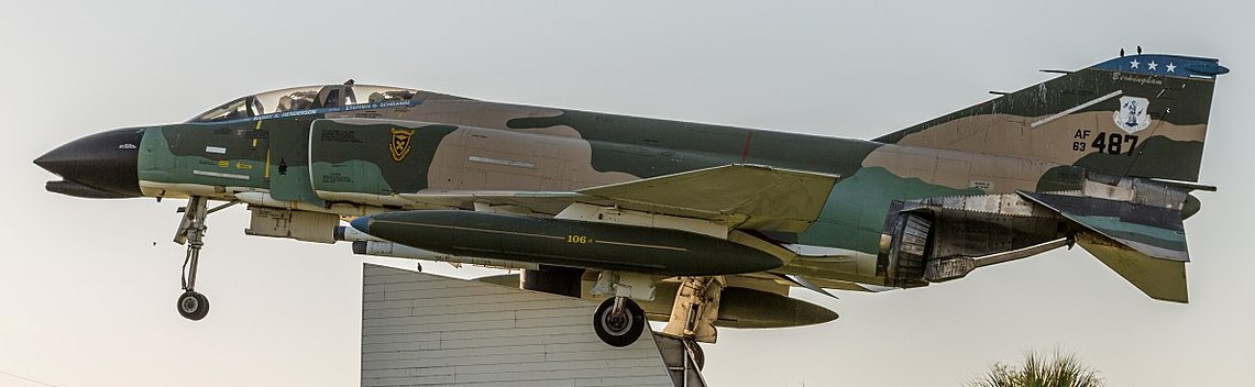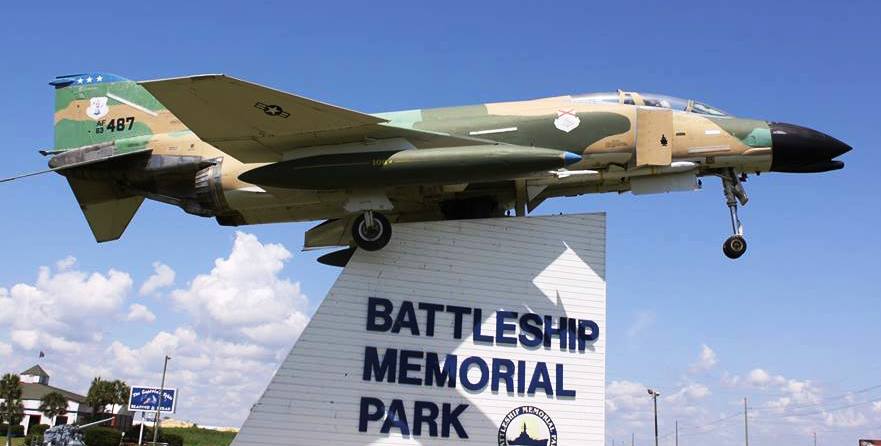 McDonnell Douglas F-4C Phantom II (Serial No. 63-7487), FA, C/N 485. This aircraft is mounted over the entrance sign to Battleship Memorial Park.