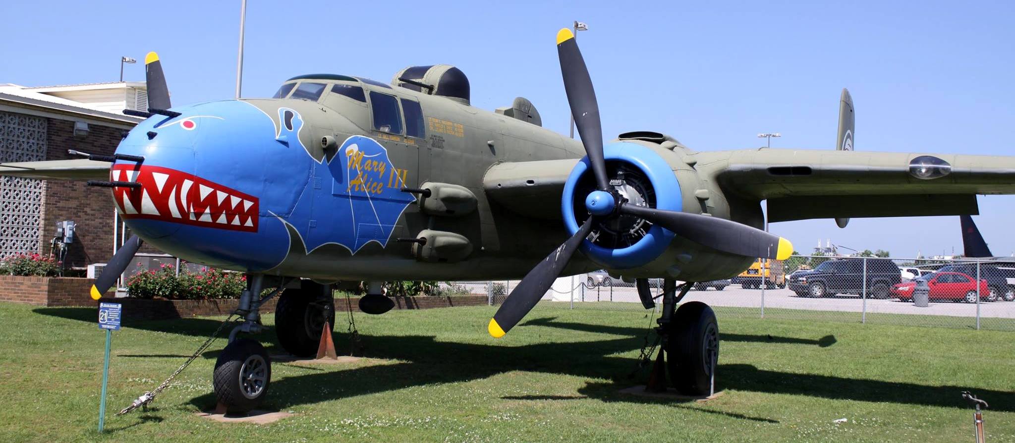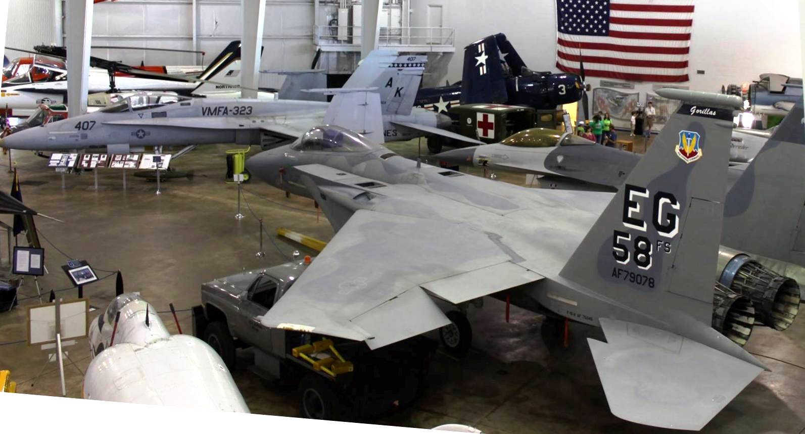 Aircraft are on display indoors in the museum hangar and outdoors alongside the Battleship USS Alabama, and the Submarine USS Drum SS-228.