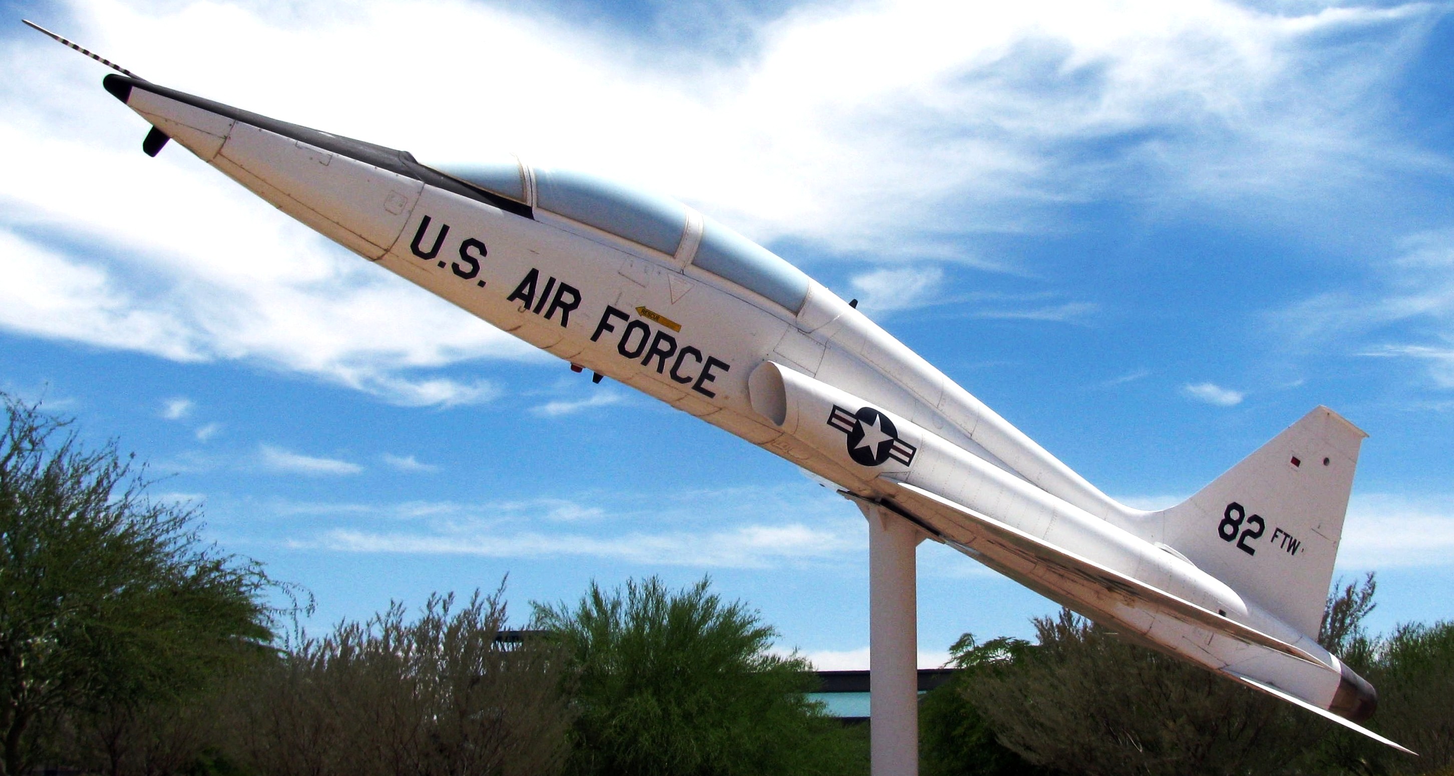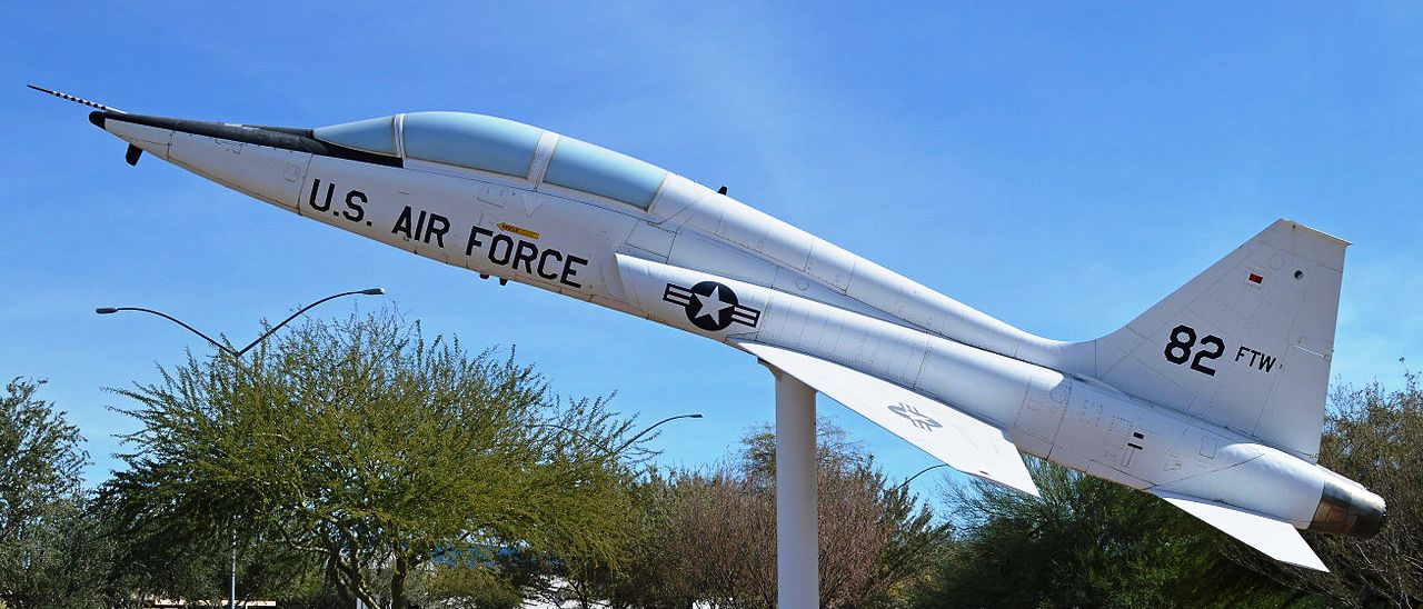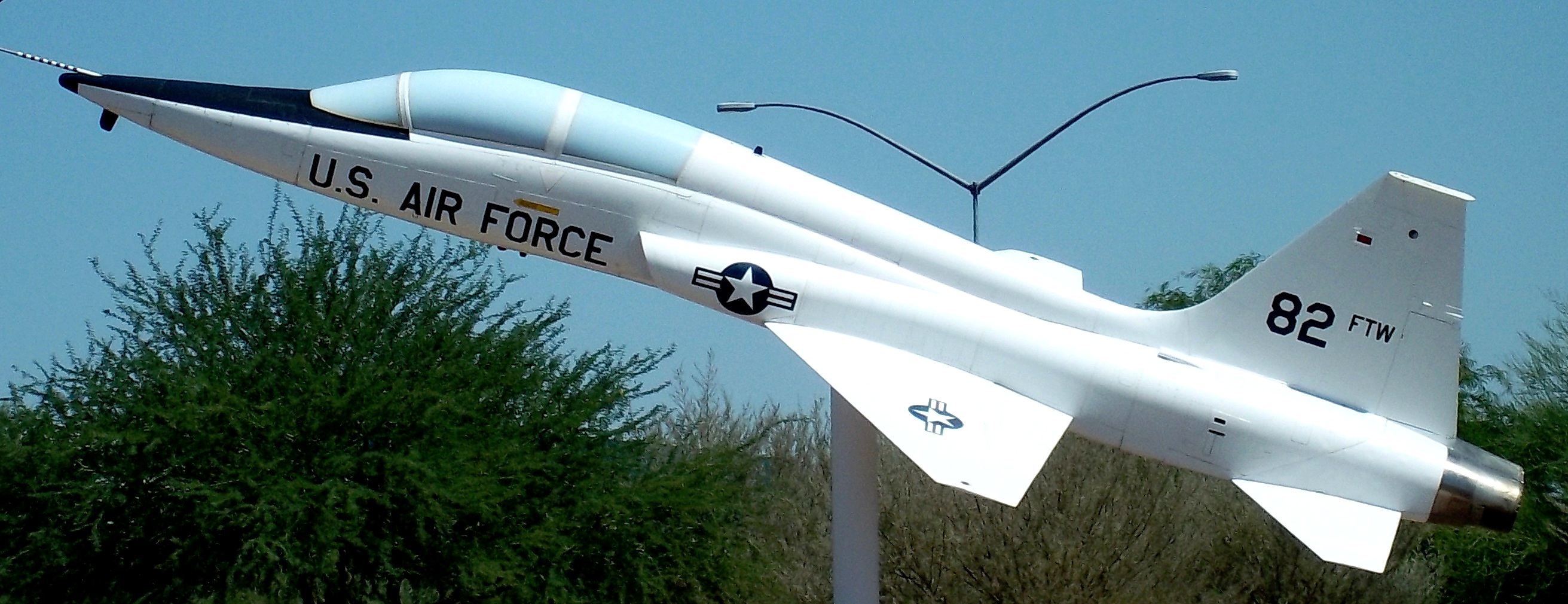 Northrop T-38A Talon (Serial No. 59-1600), c/n N.5113, Reg. No. N5117.   Displayed on a pylon on S. Sossaman Road near the entrance to Williams Gateway Airport.  82nd FTW.  This plane was originally located at the entrance of Williams Air Force Base at Williams Field and Power roads, and is on permanent loan from the U.S. Air Force.