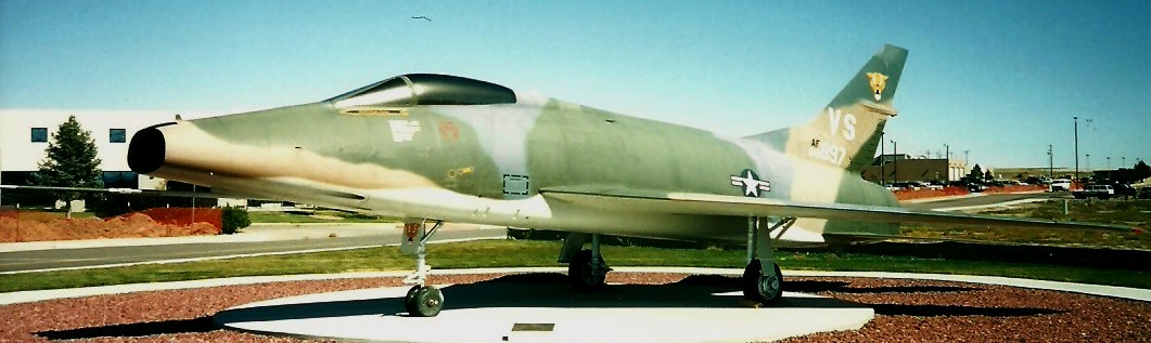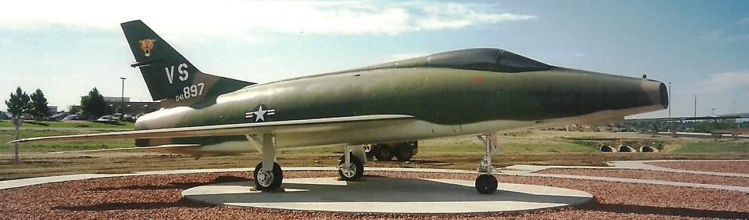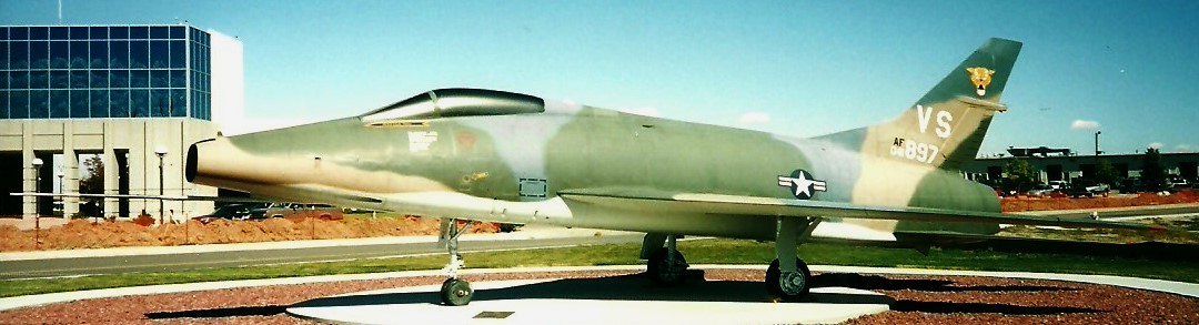 North American F-100A Super Sabre (Serial No. 53-1578), painted as (Serial No. 54-1897), VS, C/N 217-158. On a hardstand in front of the Base HQ building. Camouflage colours.