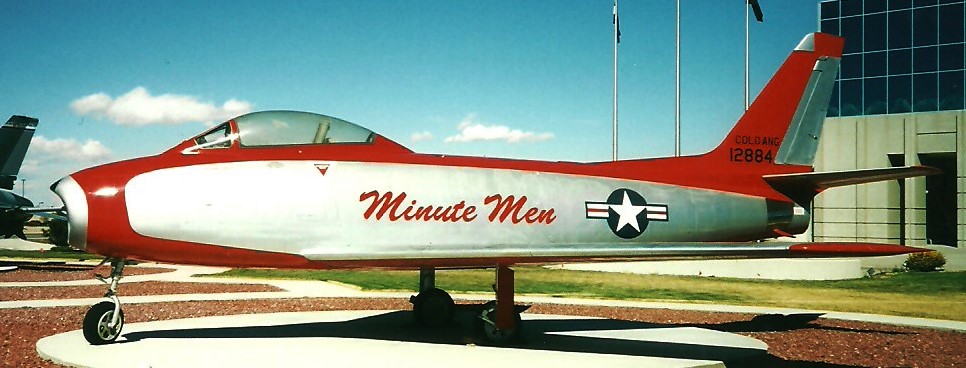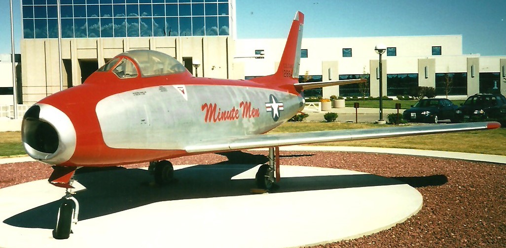 North American F-86F Sabre (Serial No. 51-13010), painted as (Serial No. 51-2884), C/N 172-167. In front of the Base HQ building. Silver with “Minute Man” colours.