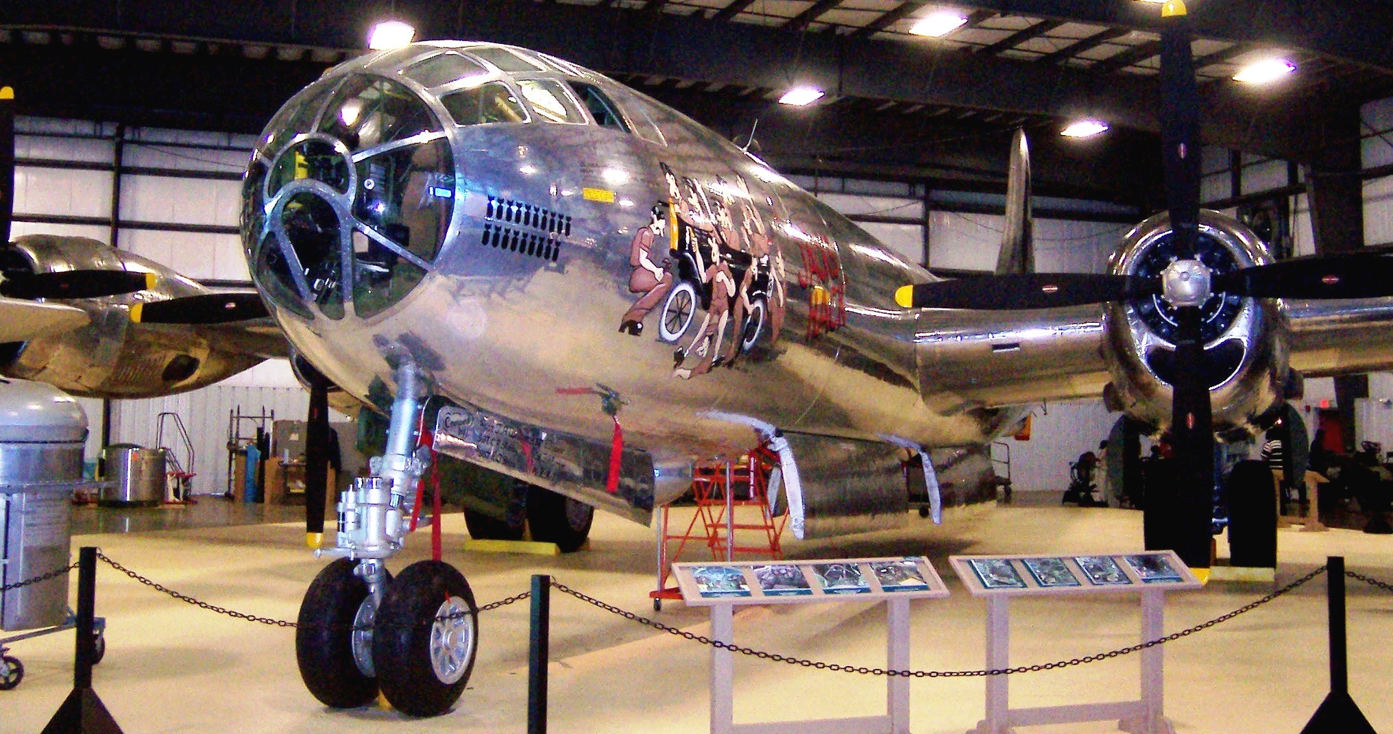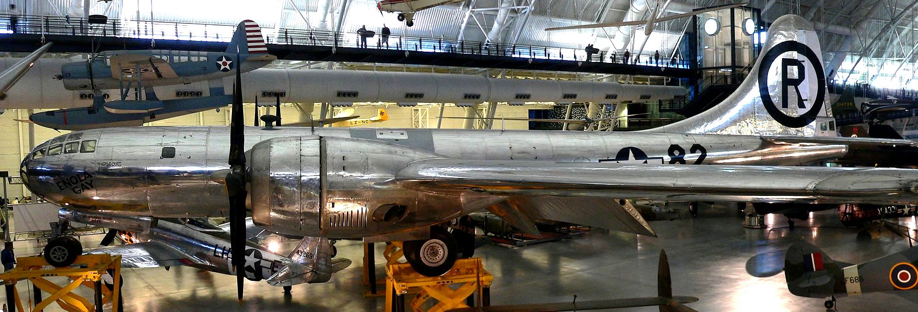 Boeing B-29 Superfortress (Serial No. 44-86292), “Enola Gay“. On 6 August 1945, “Enola Gay”, accompanied by “The Great Artiste” and “Necessary Evil,” dropped the Little Boy atomic bomb on Hiroshima. This aircraft is preserved in the National Air and Space Museum (NASM), Steven F. Udvar-Hazy Center, Washington Dulles International Airport, Chantilly, Virginia.