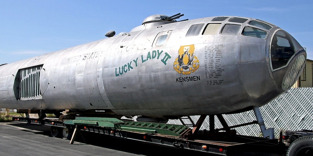 Boeing B-50A-5-BO Superfortress (Serial No. 46-0010), “Lucky Lady II”, forward fuselage, in storage.  The first nonstop around-the-world flight was accomplished by the Lucky Lady II assigned to the 43rd Bomb Group.  The flight which lasted from 26 Feb to 2 Mar 1949, took 94 hours, 1 minute to complete. Lucky Lady II flew a route covering 23,452 miles and required numerous in-flight refuelings.