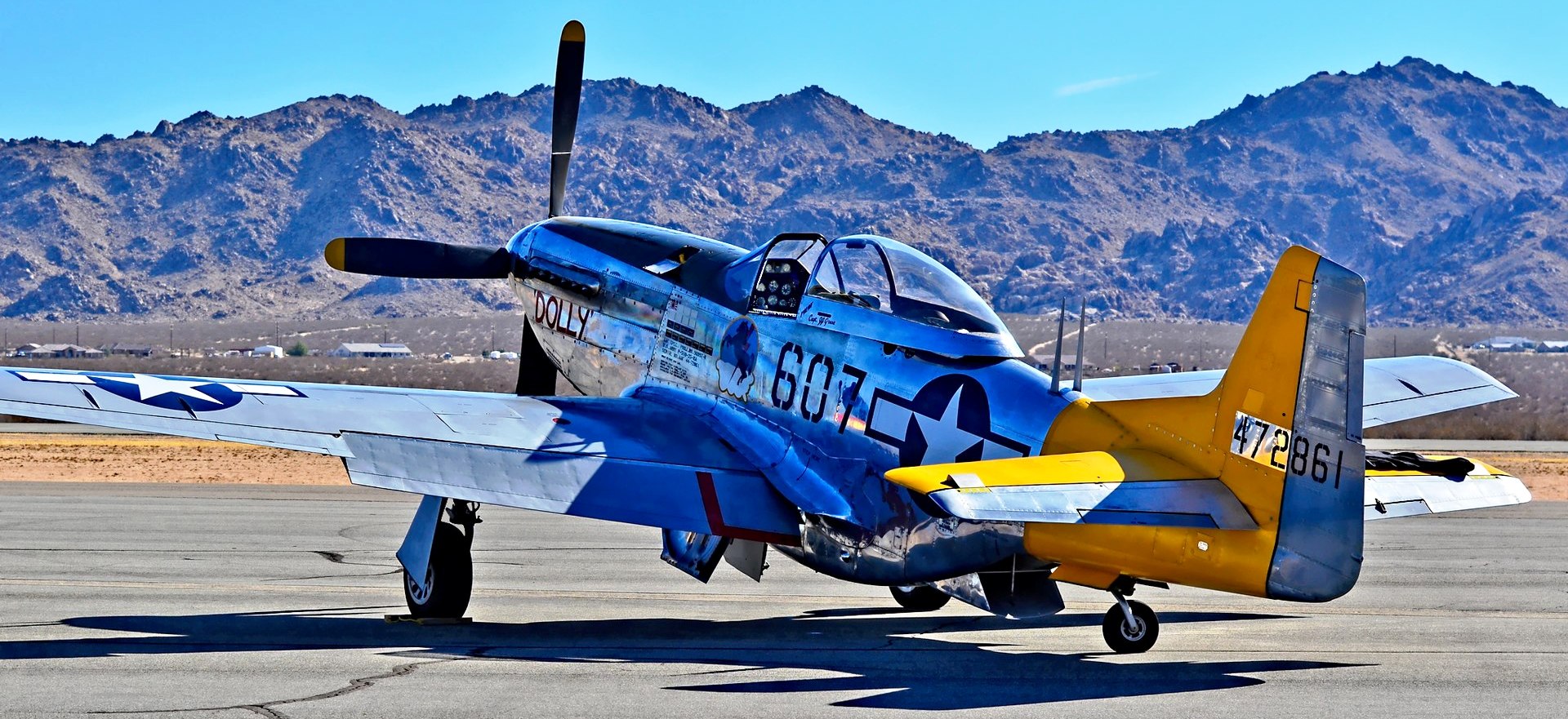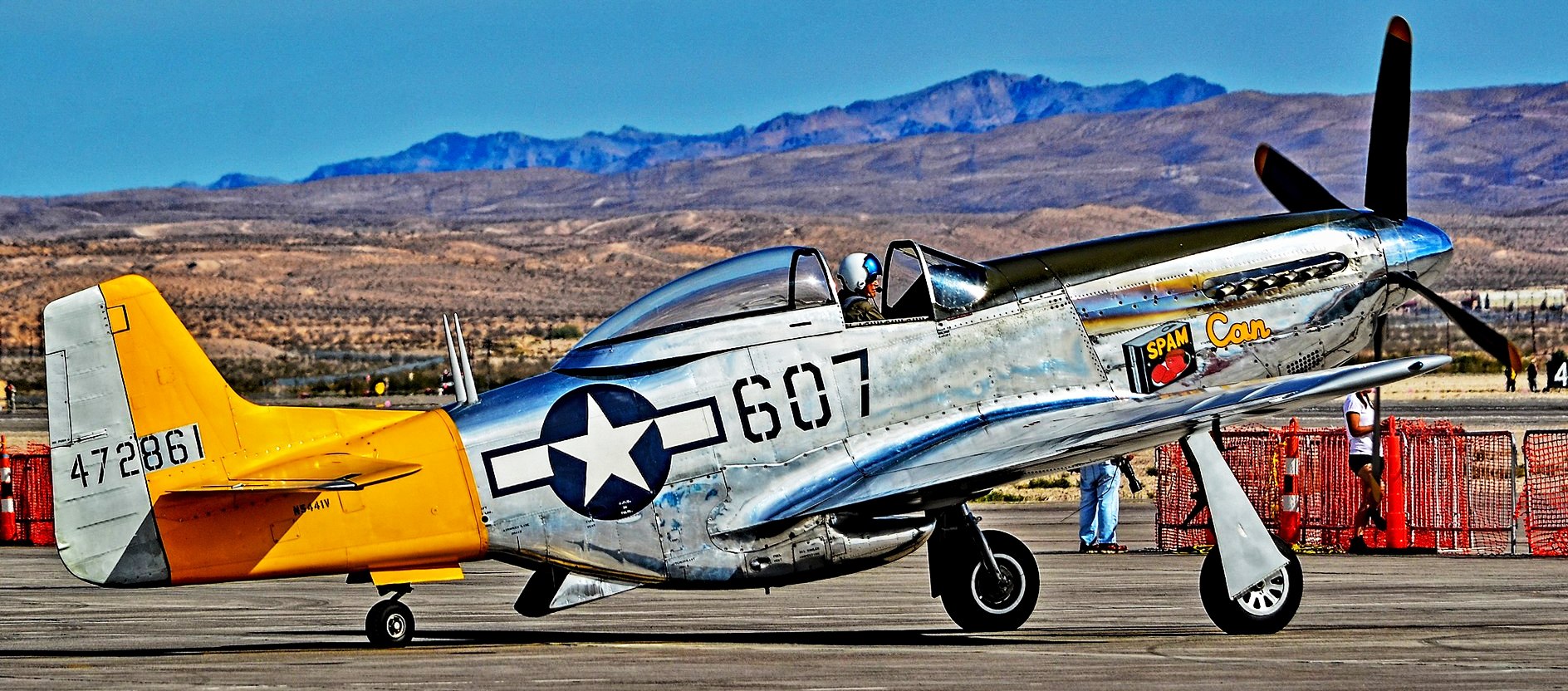 North American P-51A-10NA Mustang (Serial No. 43-6251), c/n 99-22354, RCAF No. 414 Squadron, displayed as RAF (Serial No. AG470), RU-M, “Miss Virginia“, Reg. No. N4235Y, airworthy.