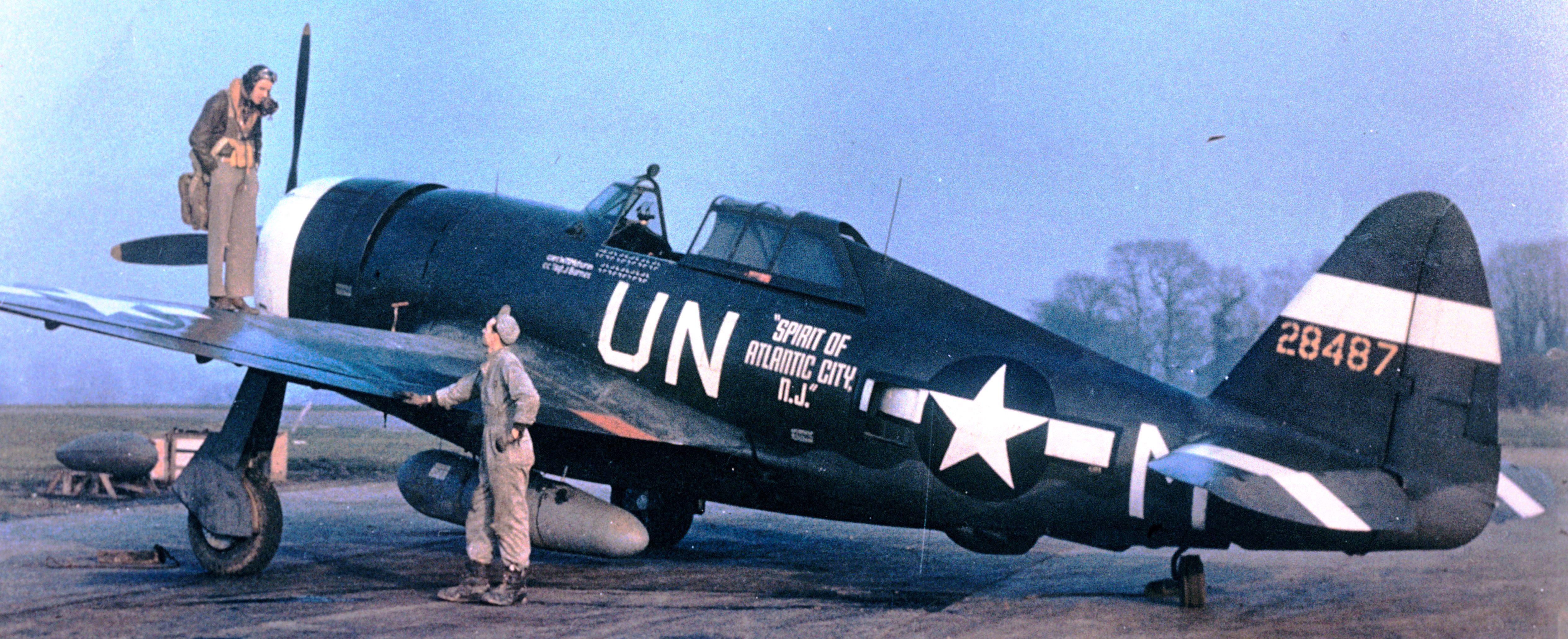Captain Walker “Bud” Mahurin of the 56th Fighter Group standing on the port wing of his P-47 Thunderbolt aircraft, conversing with its crew chief, Staff Sergeant John E. Barnes in 1943.  The aircraft had been “bought” courtesy of war bonds purchased (to a value approximately equivalent to the cost of a fighter) by the citizens of Atlantic City, New Jersey.  Consequently, the name painted on the aircraft was chosen by Atlantic City.