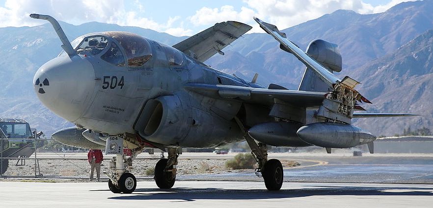 Grumman EA-6B Prowler (BuNo.), shonn here as it taxies into position for its retirement ceremony at the Palm Springs Air Museum, 21 Nov 2014.  This aircraft was part of Electronic Warfare Squadron 134 based out of Naval Air Station Whidbey Island, Washington. and had just returned from a deployment aboard the Nimitz-class Supercarrier USS George H.W. Bush in support of Operation Enduring Freedom.