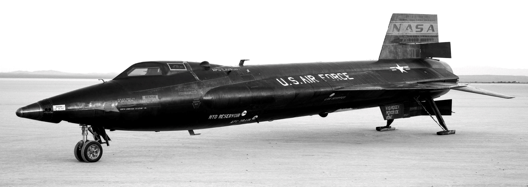 For flight in the thin air outside the Earth’s atmosphere, the X-15 used a reaction control system. Hydrogen peroxide thrust rockets on the nose of the aircraft provided pitch and yaw control. Those on the wings furnished roll control. The outer skin of the X-15 was a nickel-chrome alloy called Inconel X, employed in a heat sink structure to withstand the results of aerodynamic heating when the aircraft was flying within the atmosphere. The cabin was made of aluminum and was isolated from the outer structure to keep it cool. (NASA)