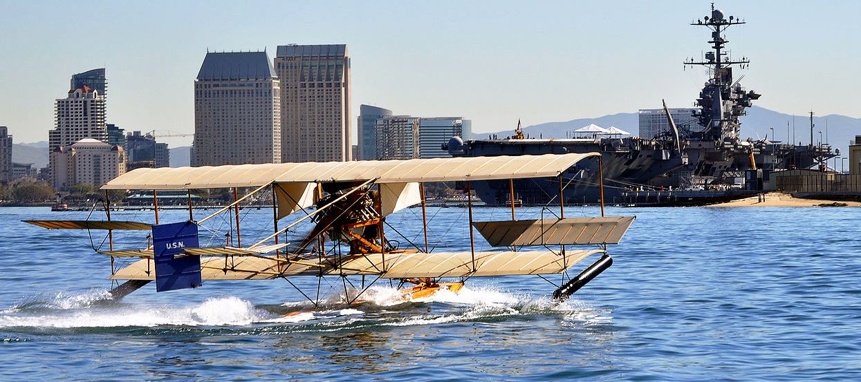 Curtiss A-1 Triad, replica, flown on 26 Jan 1984 over San Diego Bay. This functional replica of a Curtiss A-1 Triad seaplane skimmed the water in San Diego Bay in front of the aircraft carrier USS John C. Stennis during a demonstration at Naval Air Station North Island. The A-1 Triad was the first Navy plane purchased by the Navy.