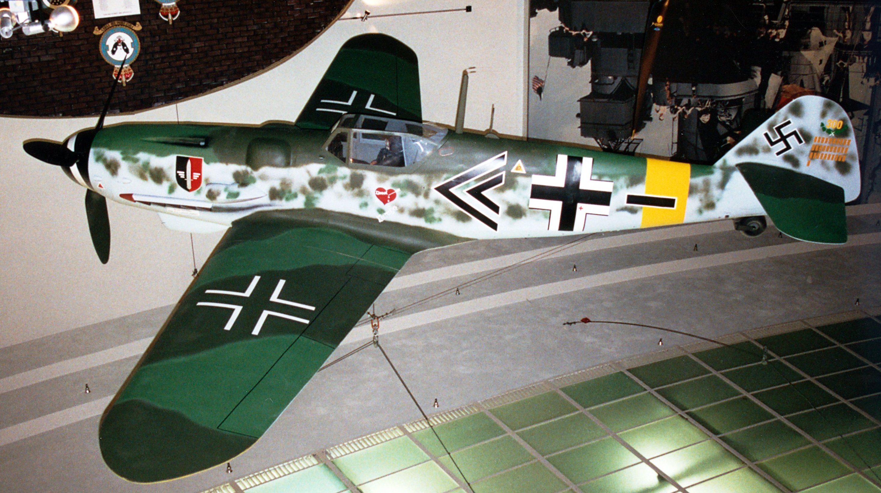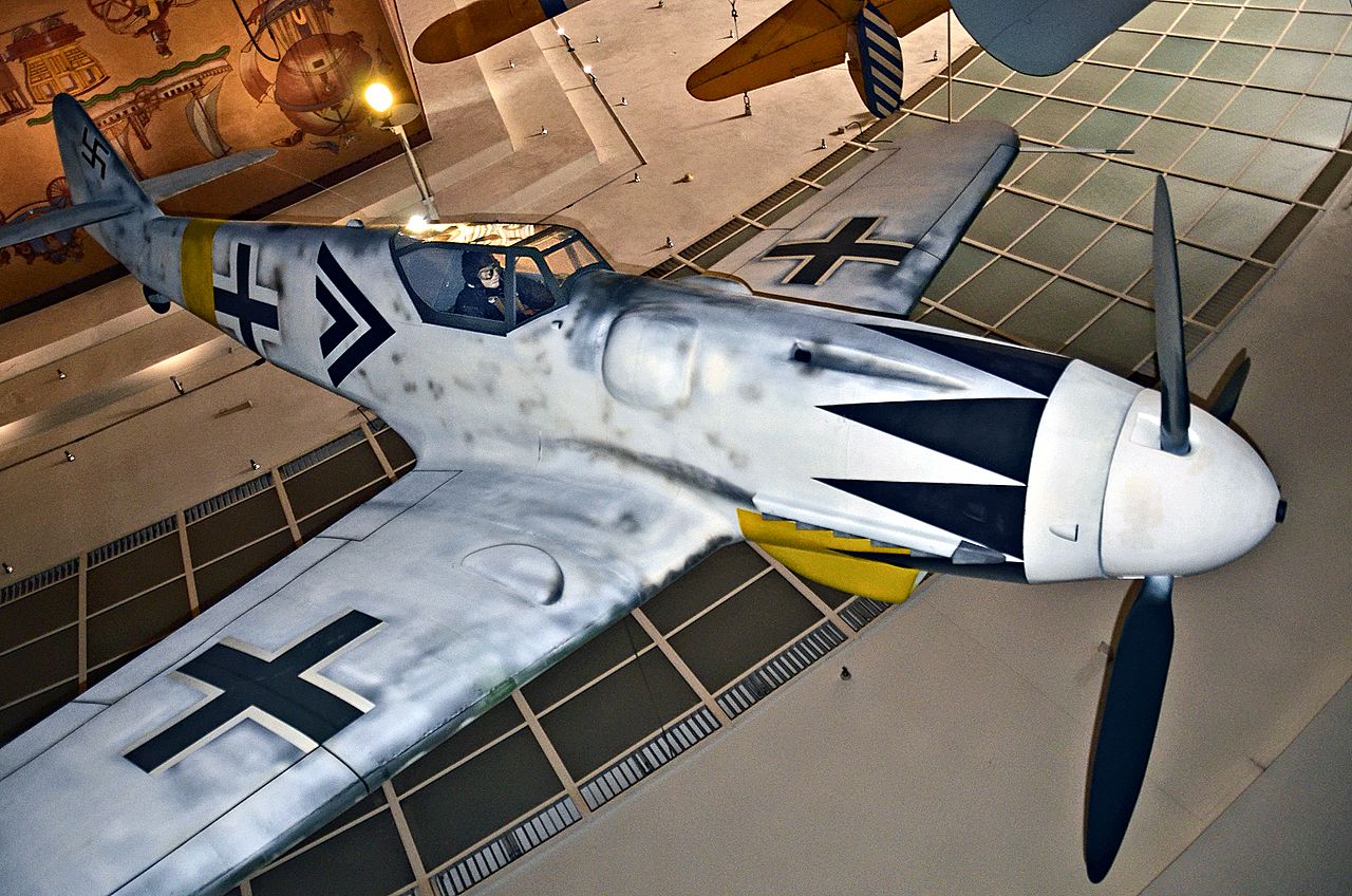 Messerschmitt Bf 109G-14 Gustav, wooden mockup, hanging inverted from the ceiling inside the museum.