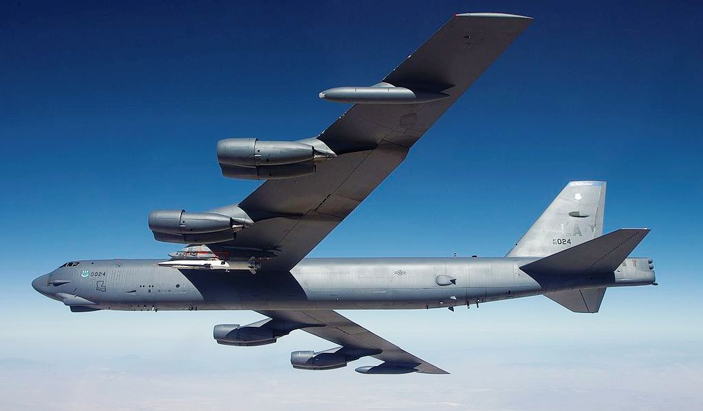Boeing B-52 Stratofortress carrying an X-51A WaveRider, attached to its the inner win, on its fourth and final mission, 1 May 2013, over the Point Mugu Naval Air Warfare Center Sea Range, California.