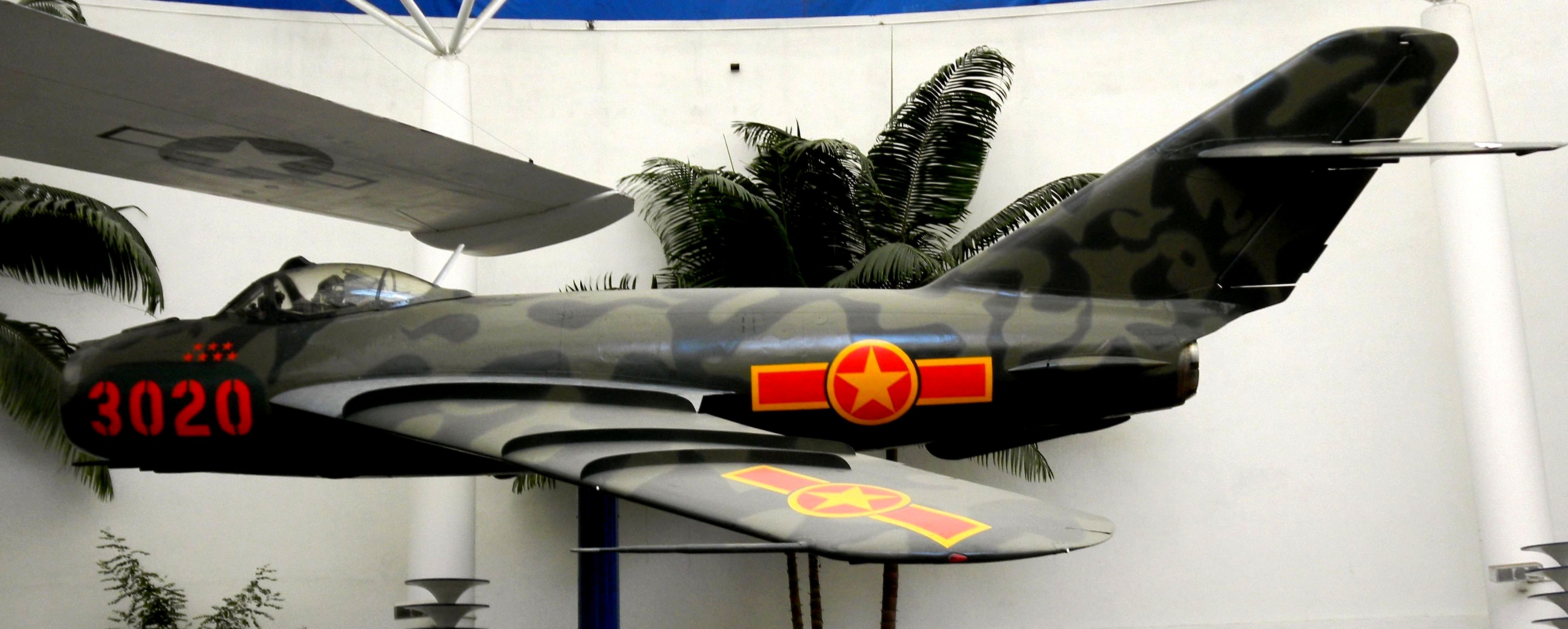 Mikoyan-Gurevich MiG-17 Fresco C (Shenyang J-5), (Serial No. 3020), c/n 799, North Vietnamese Air Force markings, mounted on a pylon inside the museum.