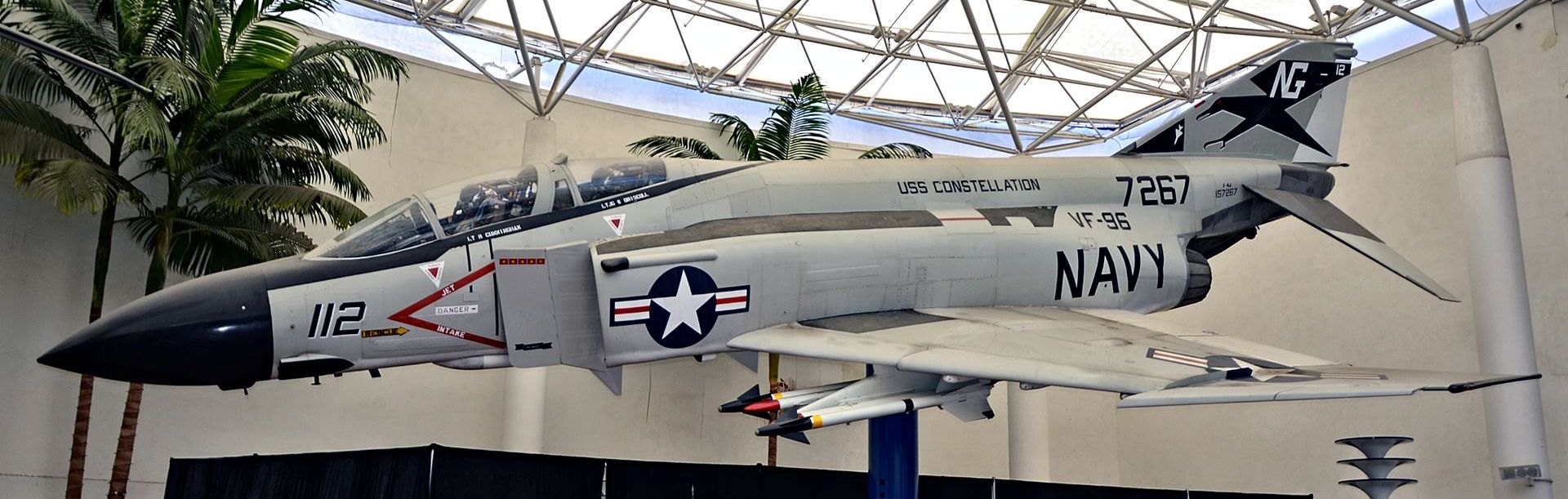 McDonnell-Douglas F-4J Phantom II (BuNo. 157267), mounted on a pylon inside the museum.