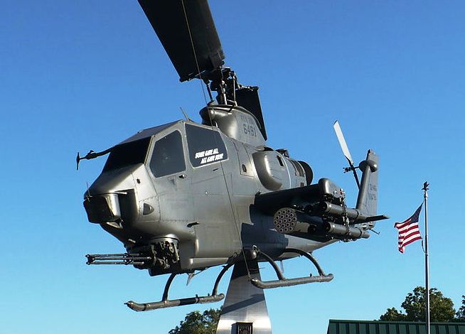 Bell AH-1F Cobra helicopter (Serial No. 68-15001), mounted on a pylon at the Veteran’s Memorial.