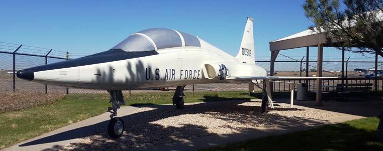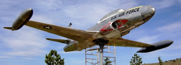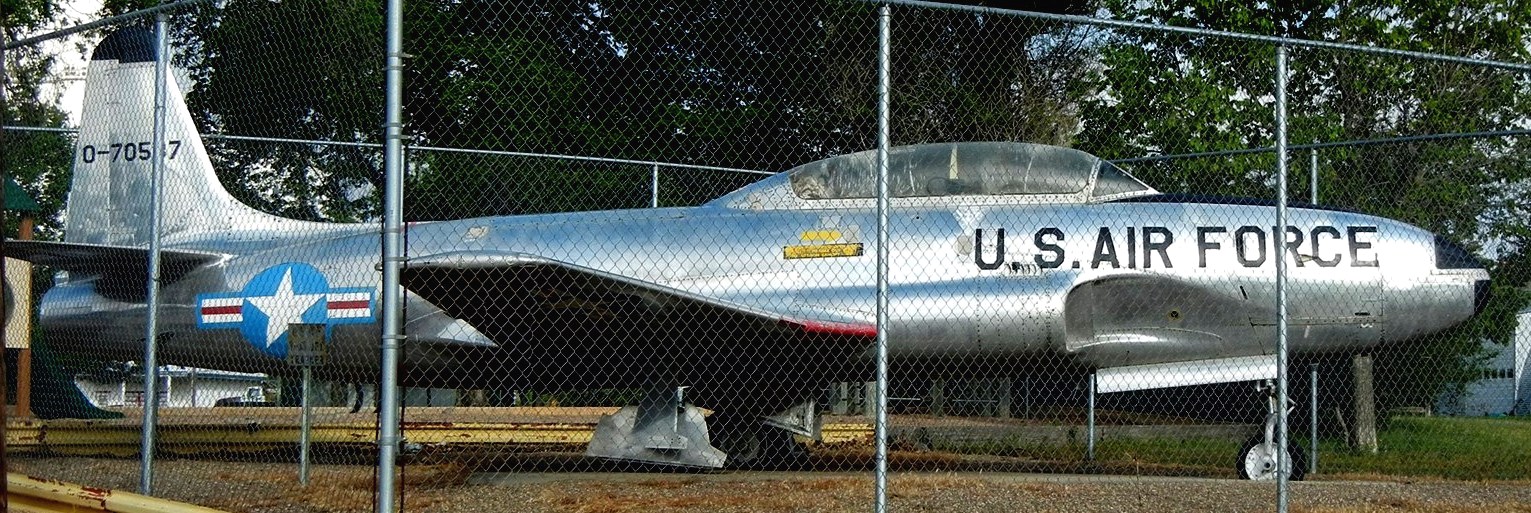 Lockheed T-33 Shooting Star (Serial No. 57-6560), mounted on a pylon in the Veteran’s Memorial Park.