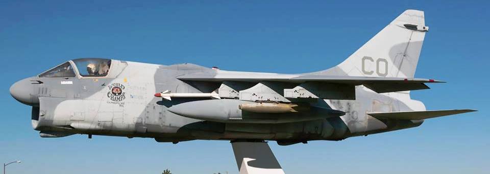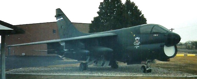 LTV A-7D Corsair II (Serial No. 70-1055), mounted on a pylon at Montrose Airport.  ThisA-7D was part of the 140th Wing, 120th Fighter Squadron.