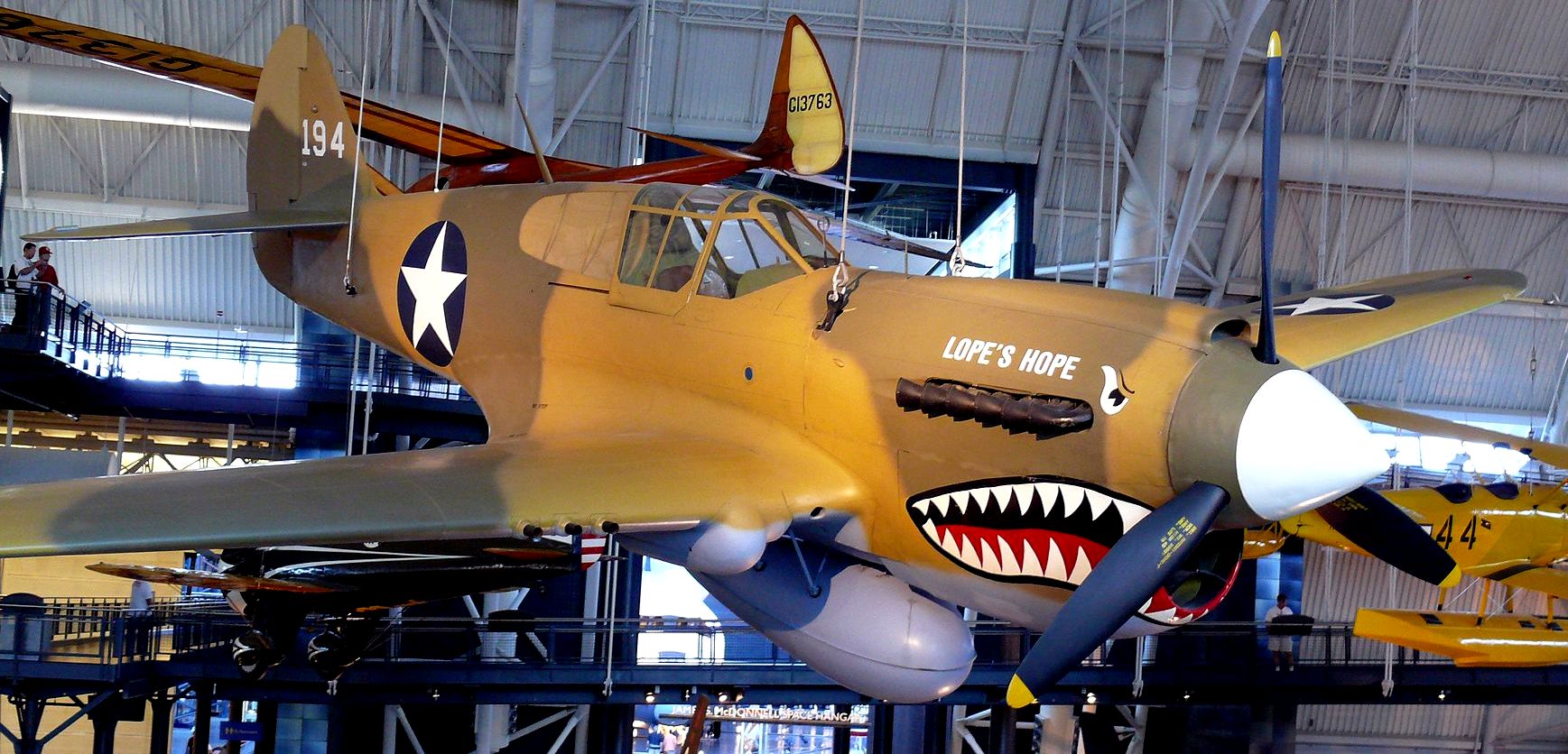 Curtiss P-40E Kittyhawk Mk. IA, RAF (Serial No. AK875), USAAF (Serial No. 41-13575), c/n 15349, ex-RCAF (Serial No. 1047), No. 111 Squadron, No. 194, “Lope’s Hope“, Reg. No. N1048N.  This aircraft is preserved in the National Air and Space Museum (NASM), Steven F. Udvar-Hazy Center, Washington Dulles International Airport, Chantilly, Virginia.
