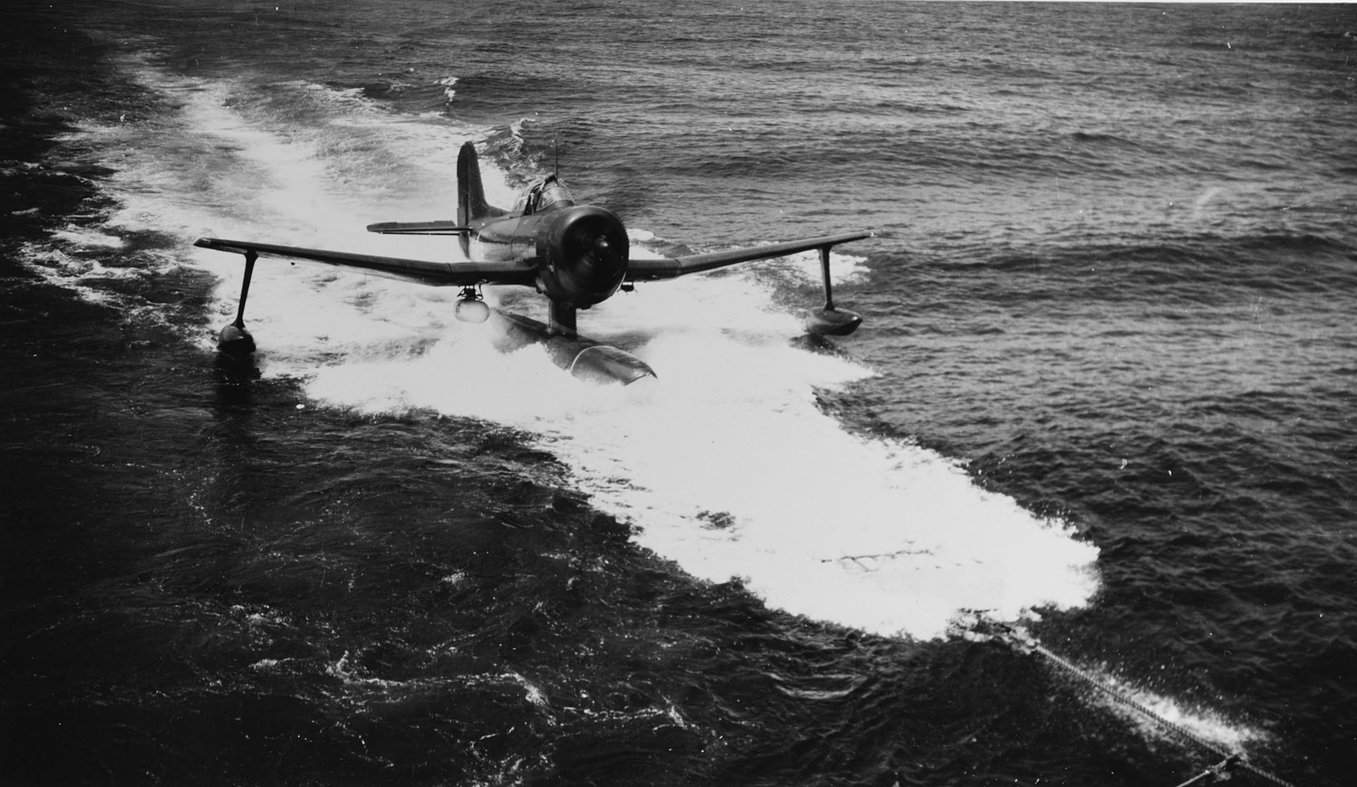A U.S. Navy Curtiss SC-1 Seahawk reconnaissance plane taxiing up to a sea-sled towed by the battleship USS Iowa (BB-61), off San Francisco, California (USA), July 1947.