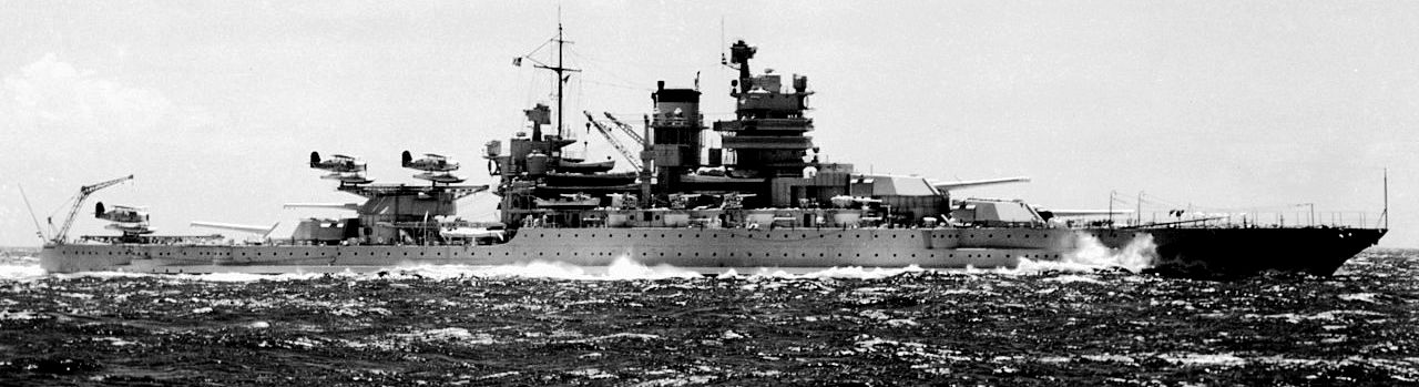 USS Mississippi (BB-41) operating at sea during the later 1930s. She has three Curtiss SOC Seagull aircraft on her catapults.