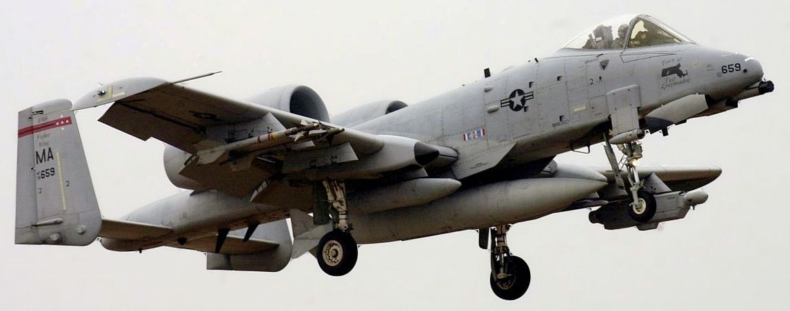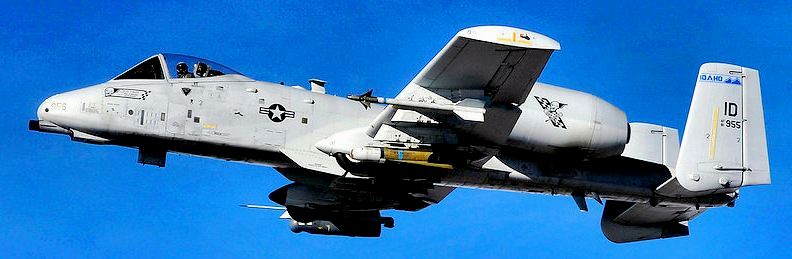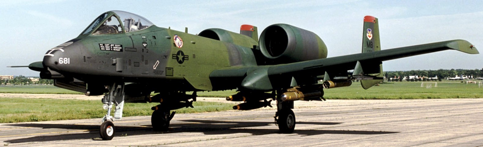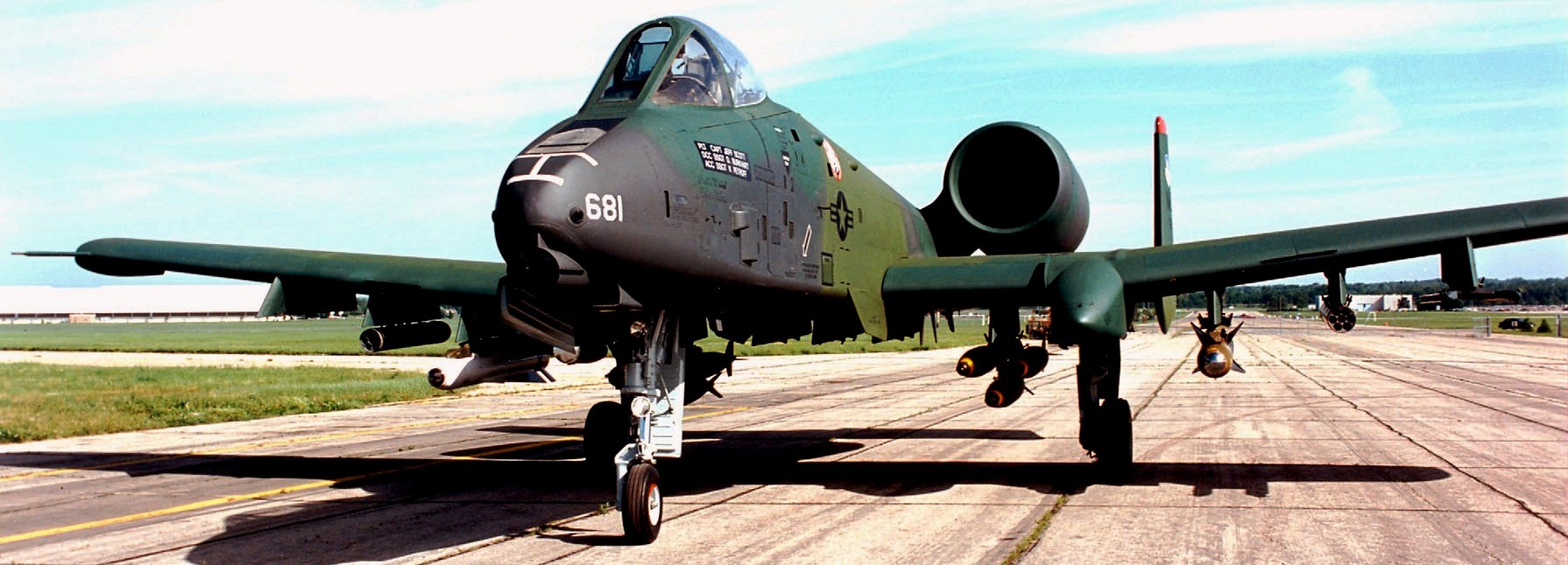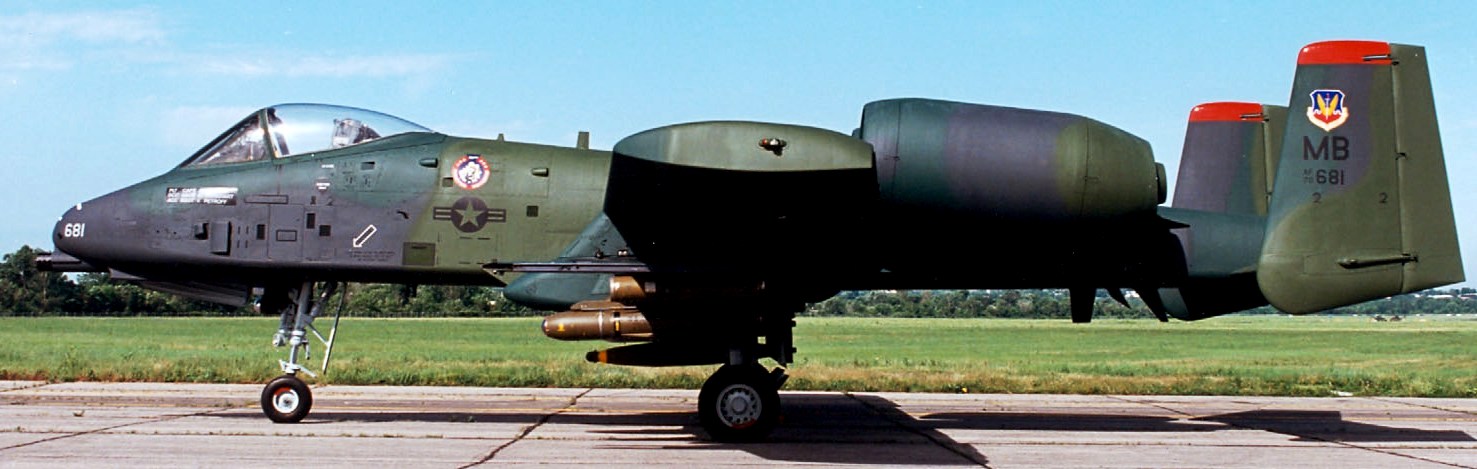 Primary Function: A-10 close air support, airborne forward air control, combat search and rescueContractor: Fairchild Republic Co.Power Plant: Two General Electric TF34-GE-100 turbofansThrust: 9,065 pounds each engineLength: 53 feet, 4 inches (16.16 meters)Height: 14 feet, 8 inches (4.42 meters)Wingspan: 57 feet, 6 inches (17.42 meters)Speed: 420 miles per hour (Mach 0.56)Ceiling: 45,000 feet (13,636 meters)Maximum Takeoff Weight: 51,000 pounds (22,950 kilograms)Range: 800 miles (695 nautical miles)Armament: One 30mm GAU-8/A seven-barrel Gatling gun; up to 16,000 pounds (7,200 kilograms) of mixed ordnance on eight under-wing and three under-fuselage pylon stations, including 500 pound (225 kilograms) Mk-82 and 2,000 pounds (900 kilograms) Mk-84 series low/high drag bombs, incendiary cluster bombs, combined effects munitions, mine dispensing munitions, AGM-65 Maverick missiles, laser-/GPS-guided bombs, unguided and laser-guided 2.75-inch (6.99 centimeters) rockets; infrared countermeasure flares; electronic countermeasure chaff; jammer pods; illumination flares and AIM-9 Sidewinder missiles.Crew: OneDate Deployed: March 1976Unit Cost: $9.8 million (fiscal 98 constant dollars)Inventory: Total Force – approximately 281. (USAF)