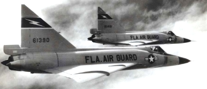 Convair F-102A-75-CO Delta Dagger fighters (56-1390, 561418) of the 159th Fighter Interceptor Squadron, 125th Fighter Interceptor Wing, Florida Air National Guard, ca 1960s.