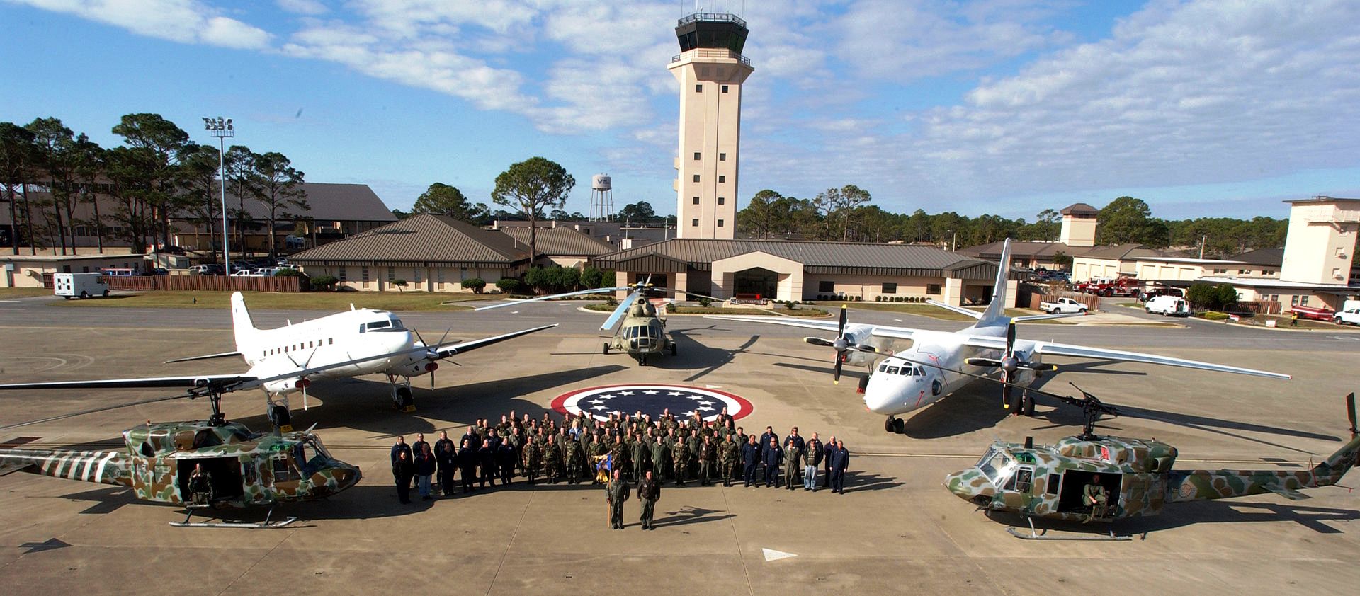6th Special Operations Squadron and their aircraft. The two closest are Bell UH-1N Iroquois helicopterss; the white aircraft on the left is a Douglas C-47T Turboprop conversion; the white plane on the right is an Antonov An-26 (a Ukrainian turboprop transport aircraft), and the helicopter in the back is a Russian Mi-8 Hip helicopter.
