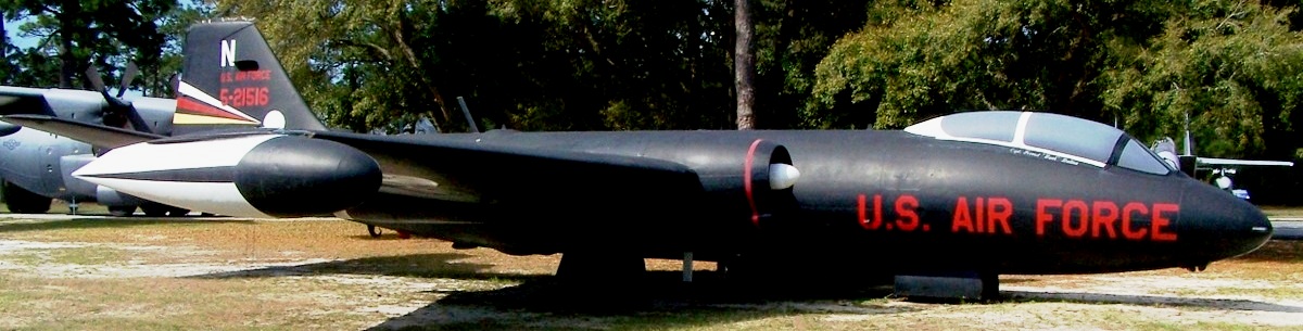 Martin EB-57B Canberra Night Intruder (Serial No. 52-1516), c/n 099. 52-1516 was last flown by the 158th Air National Guard stationed at Burlington, VT. Only 22 B-57Bs were converted to EB-57Bs. The B-57 saw service in Vietnam, out of 94 B-57s assigned to the Vietnam theatre – 51 were lost in combat. This aircraft is being depicted in its black “Night Intruder” paint scheme, as a B-57B assigned to the 8th Bomb Squadron, 35th Tactical Fighter Wing while stationed at Phan Rang AB, Vietnam.