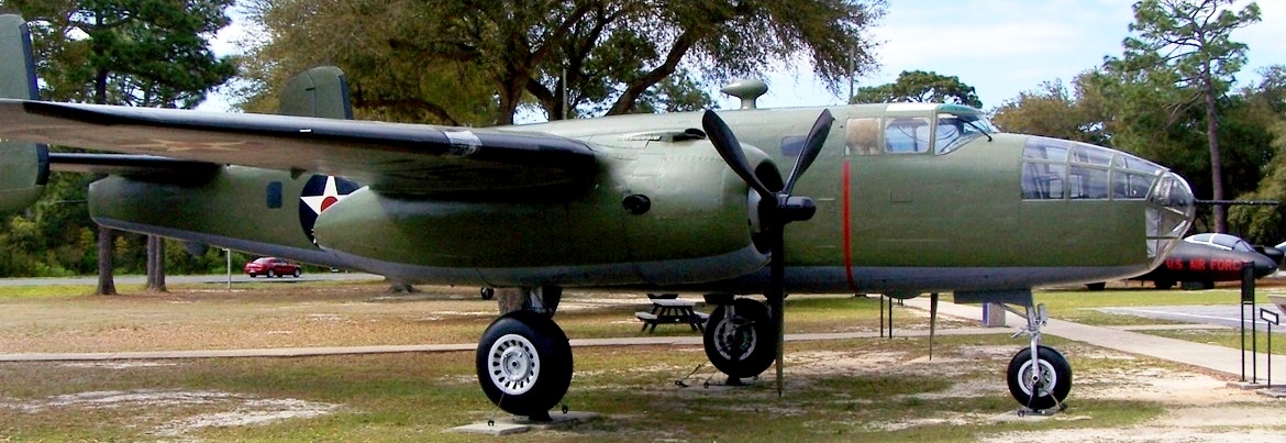 North American B-25J Mitchell (Serial No. 44-30854), painted as 02344, c/n 108-34129. 44-30854 was delivered on 08 March 1945, it was modified to a TB-25N in March 1954 and was the last B-25 when dropped from USAF inventory on June 1960. It is being depicted as B-25B S/N 40-2344 flown by General (then LtCol) James H. Doolittle during the “Tokyo Raid” mission. The Doolittle Raiders trained for their secret mission at Eglin Field (now Eglin AFB), FL. This aircraft was presented to the AF Armament Museum by the cities of Valparaiso and Niceville, FL on 15 September 1975.