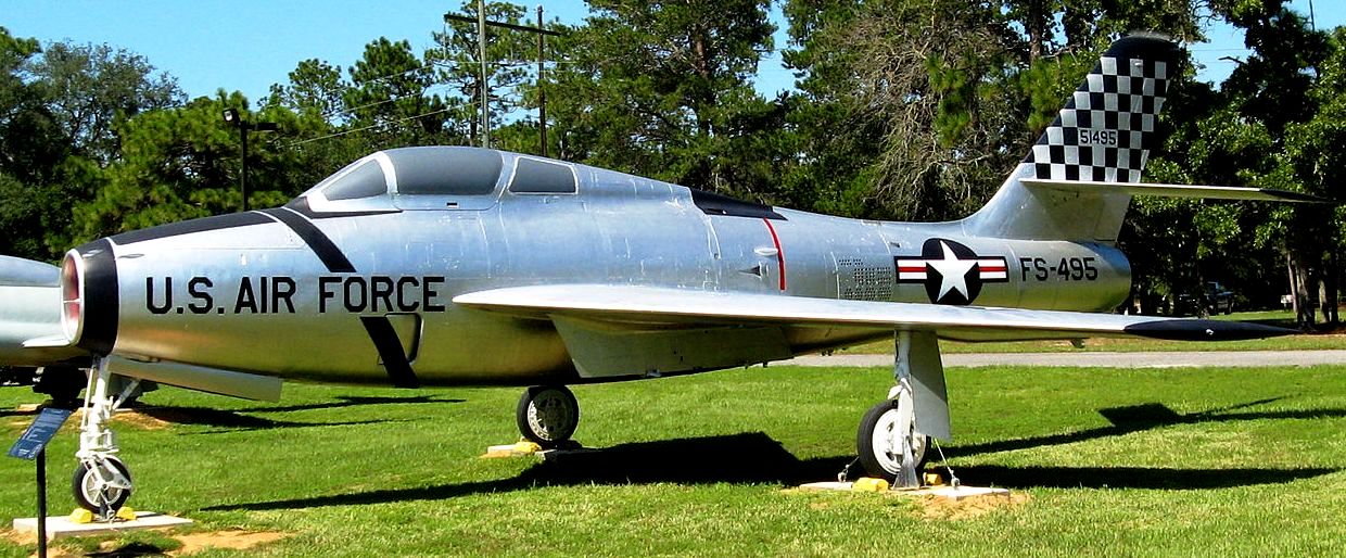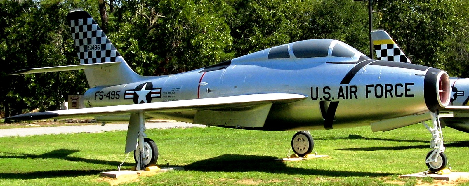 Republic F-84F Thunderstreak (Serial No. 51-9495), painted as 51495, FS-495. 51-9495 is painted in the 401st Fighter-Bomber Wing’s colours. The 401st FBW was stationed at England AFB, LA and had deployments to Eglin AFB, FL. The F-84F brought stardom to the 401st when they participated in the filming of the “The McConnell Story”, eight aircraft were painted blue with MIG-15 markings to simulate enemy aircraft during the Korean conflict in the aerial combat scenes of the movie.