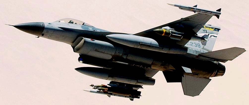 General Dynamics F-16C Block 25C Fighting Falcon (Serial No. 84-1238), 163rd Fighter Squadron Blacksnakes, 122nd Fighter Wing, Indiana Air National Guard, over Iraq, 16 August 2004. The F-16 is equipped with an AIM-120C (left wing tip), a pair of GBU-12 bombs, an AN/AAQ-28(V) targeting pod, an GBU-31 JDAM, and an AIM-120A (right wing tip).