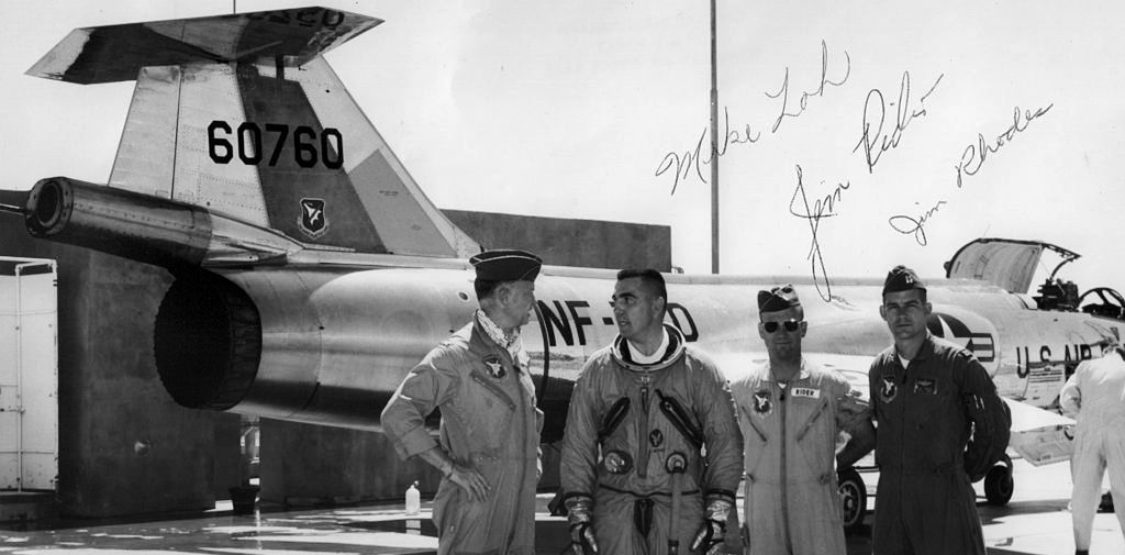 Lockheed NF-104A Starfighter  (Serial No. 56-0760), c/n 183-1048, NF-760, composite with parts from (Serial No. 56-0756), this aircraft was the SR-71 first flight chase plane.  Mounted on a pylon outside the Test Pilot School.  USAF Aerospace Research Pilot School (ARPS) commandant Eugene Deatrick (51A), student Mike Loh (67B), and instructors Jim Rider (65C) and Jim Rhodes (66A) in front of Lockheed NF-104A (Serial No. 56-0760), 1 June 1968.