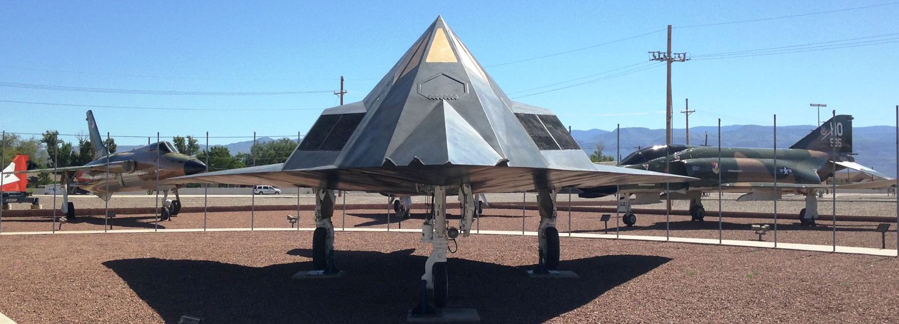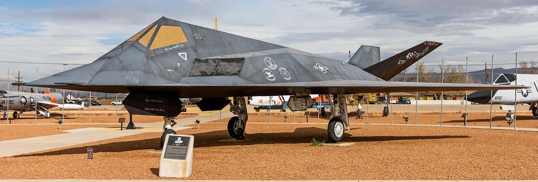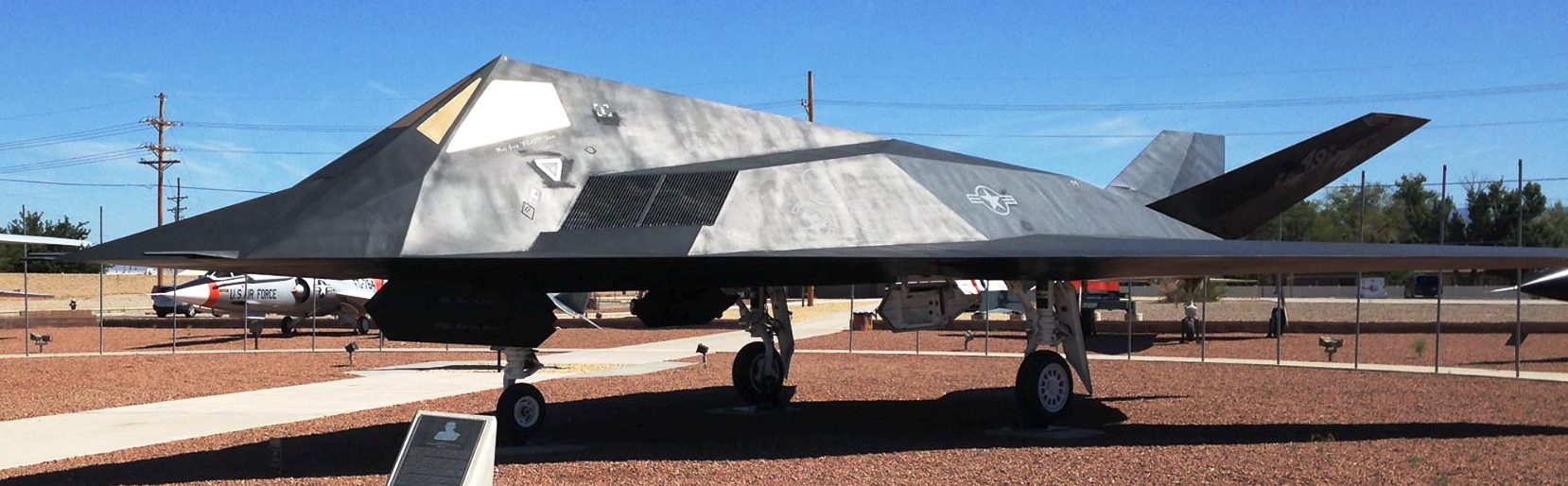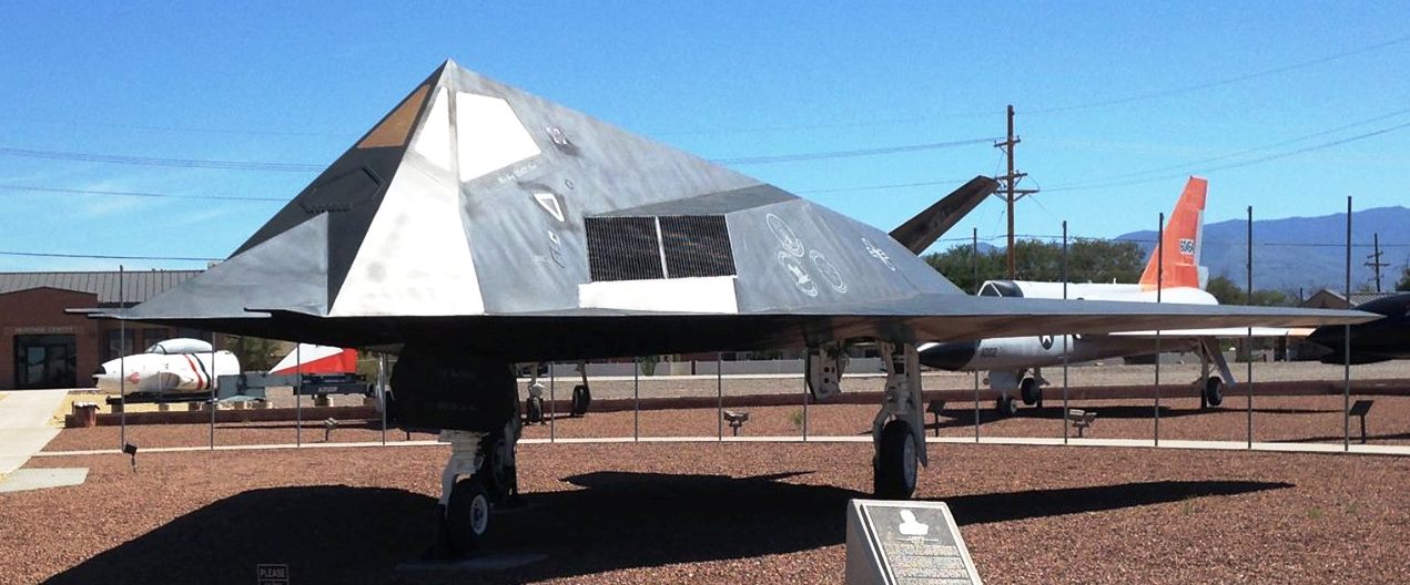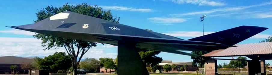 80-0785 – Pole-mounted outside the Skunk Works facility at United States Air Force Plant 42 in Palmdale, California. Hybrid airframe comprising the wreckage of 80–0785, the first production F-117A, and static test articles 778 and 779. It is mounted on a pedestal and serves as a monument.
