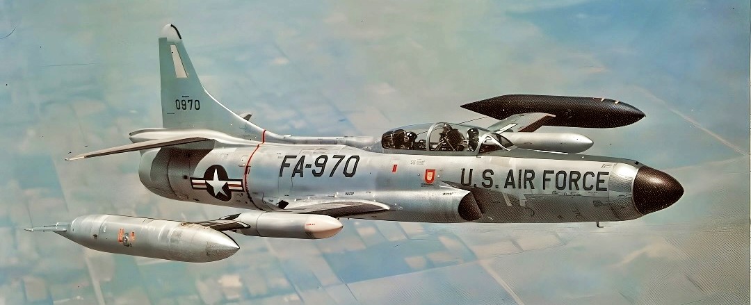 59th Fighter-Interceptor Squadron F-94B Otis AFB 1952 Two F-94Bs flying over Cape Cod. Lockheed F-94B-1-LO Starfire 50-870 and 50-872 870 marked as commander’s aircraft.