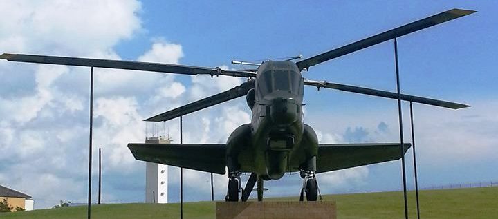Hughes OH-6A Cayuse Helicopter (Serial No. 65-12950), mounted on pylons in front of the museum.