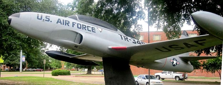 Lockheed T-33A-5-LO (Serial No. 53-6053), mounted on a concrete stand in front of Louisiana State University’s Tiger Stadium.