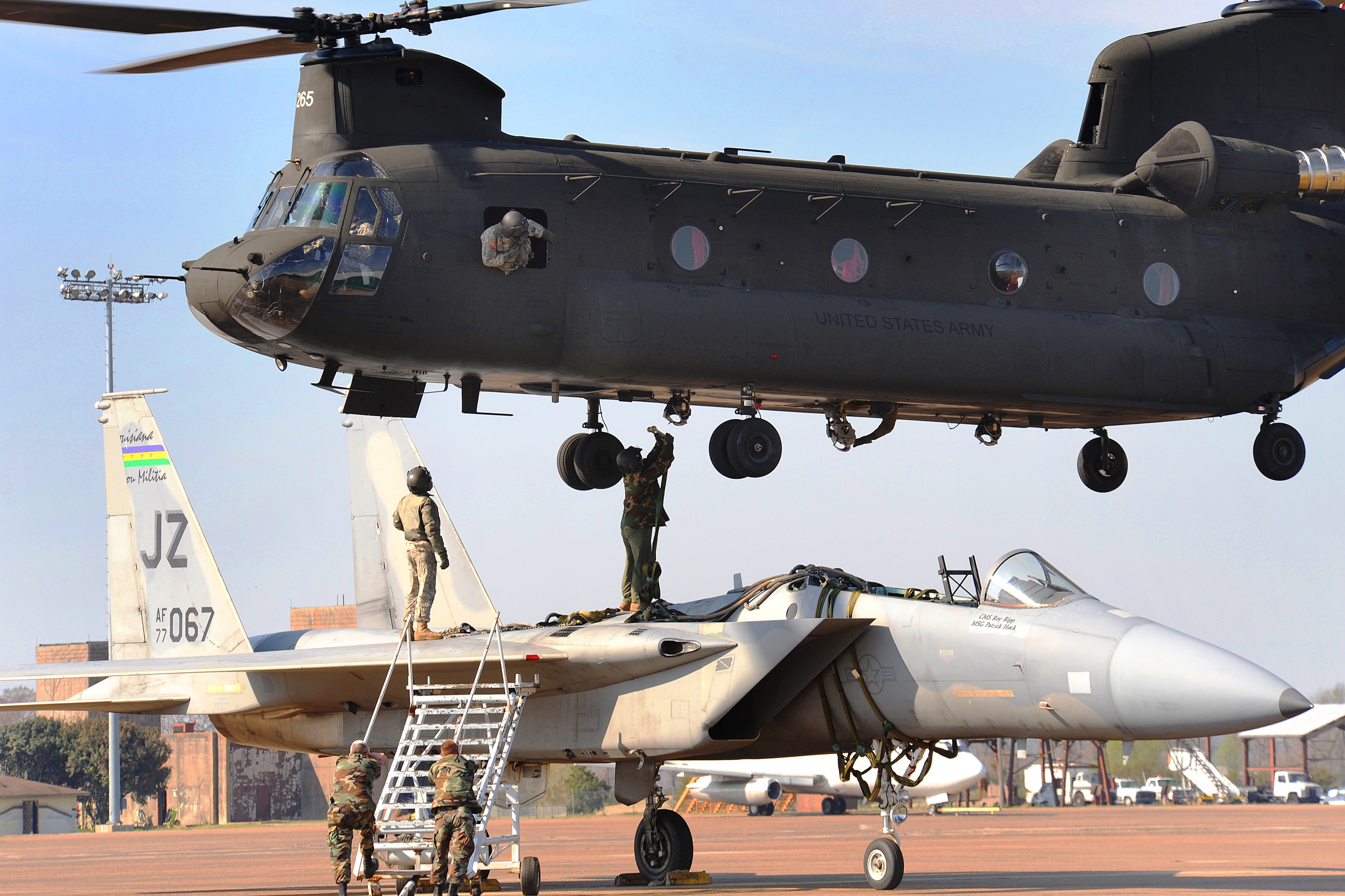 Louisiana Army National Guard, Air National Guard and Mississippi Army National Guardsmen joined forces to accomplish an impressive mission that involved a Boeing CH-47 Chinook helicopter towing a McDonnell-Douglas F-15A Eagle (Serial No. 77-0067) static display from England Air Park to Camp Beauregard on 4 March 2009.
