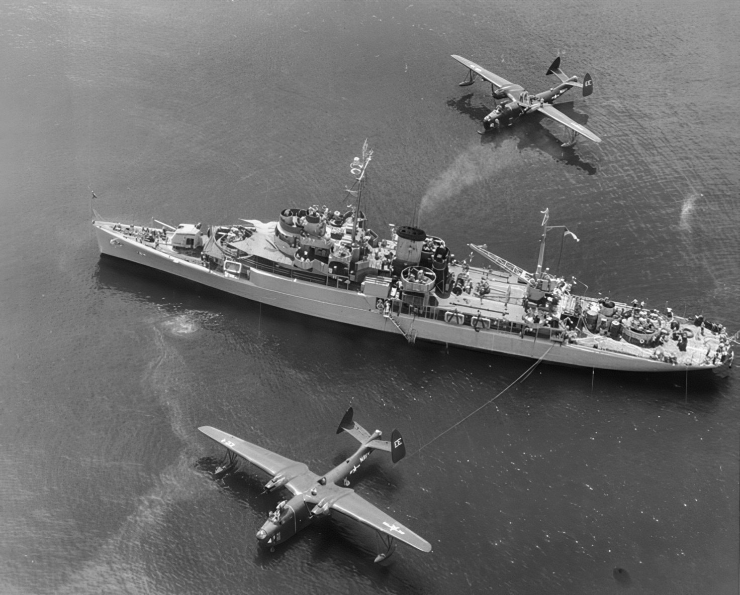 Seaplane tender USS Tembalier (AVP 54), operating with two Martin PBM Mariner flying boats in late 1948.