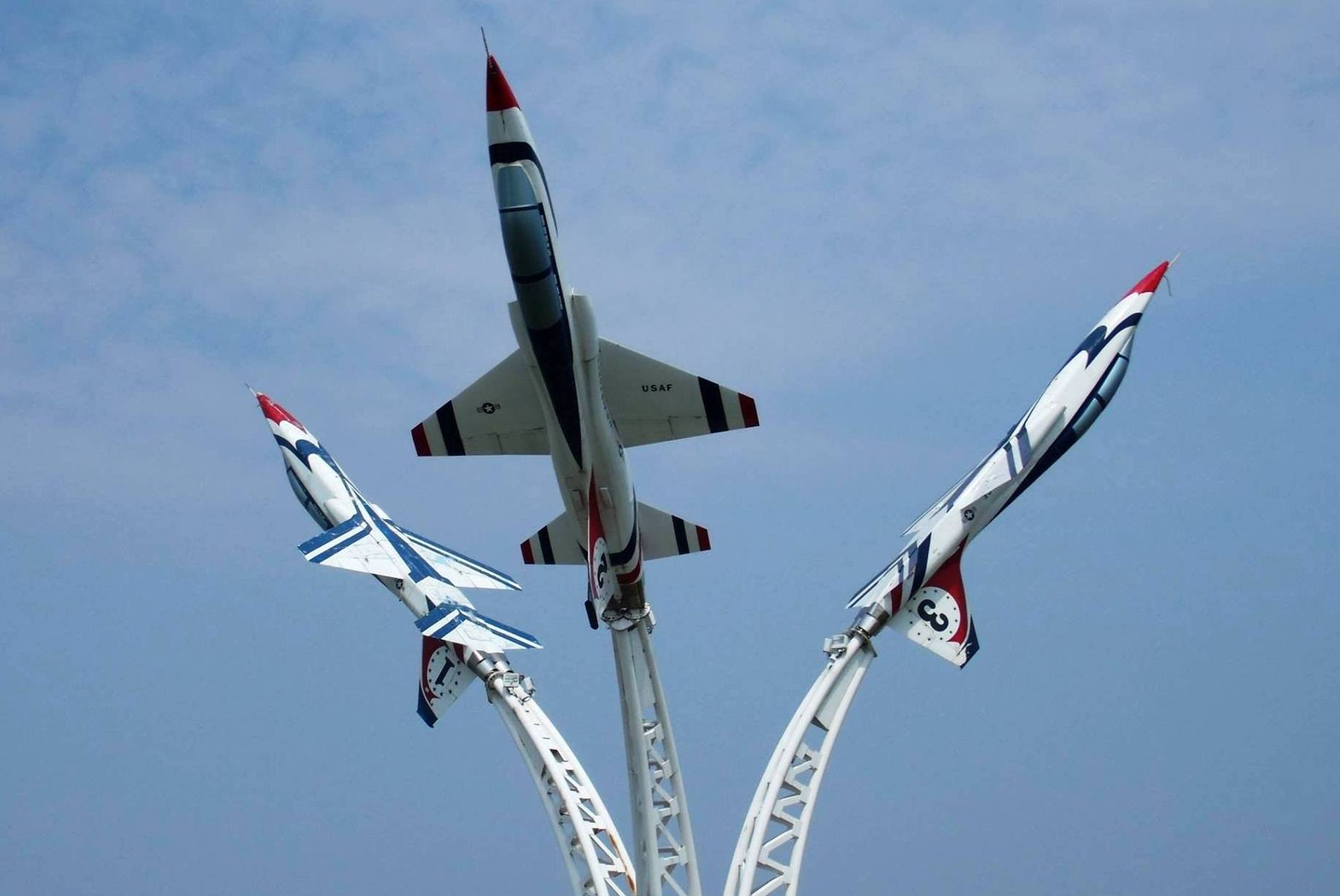 Northrop T-38 Talon (Serial No. 60-0589). No. 3, all three aircraft are mounted on a joint three-way vertical set of pylons wearing Thunderbirds markings.