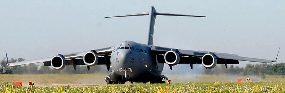 Boeing C-17A Globemaster III aircraft assigned to the Mississippi Air National Guard landing at Mirgorod Air Base, Ukraine, 16 July 2011, to deliver equipment and personnel taking part in Safe Skies 2011. Safe Skies wAs a joint US, Ukraine and Polish exercise.