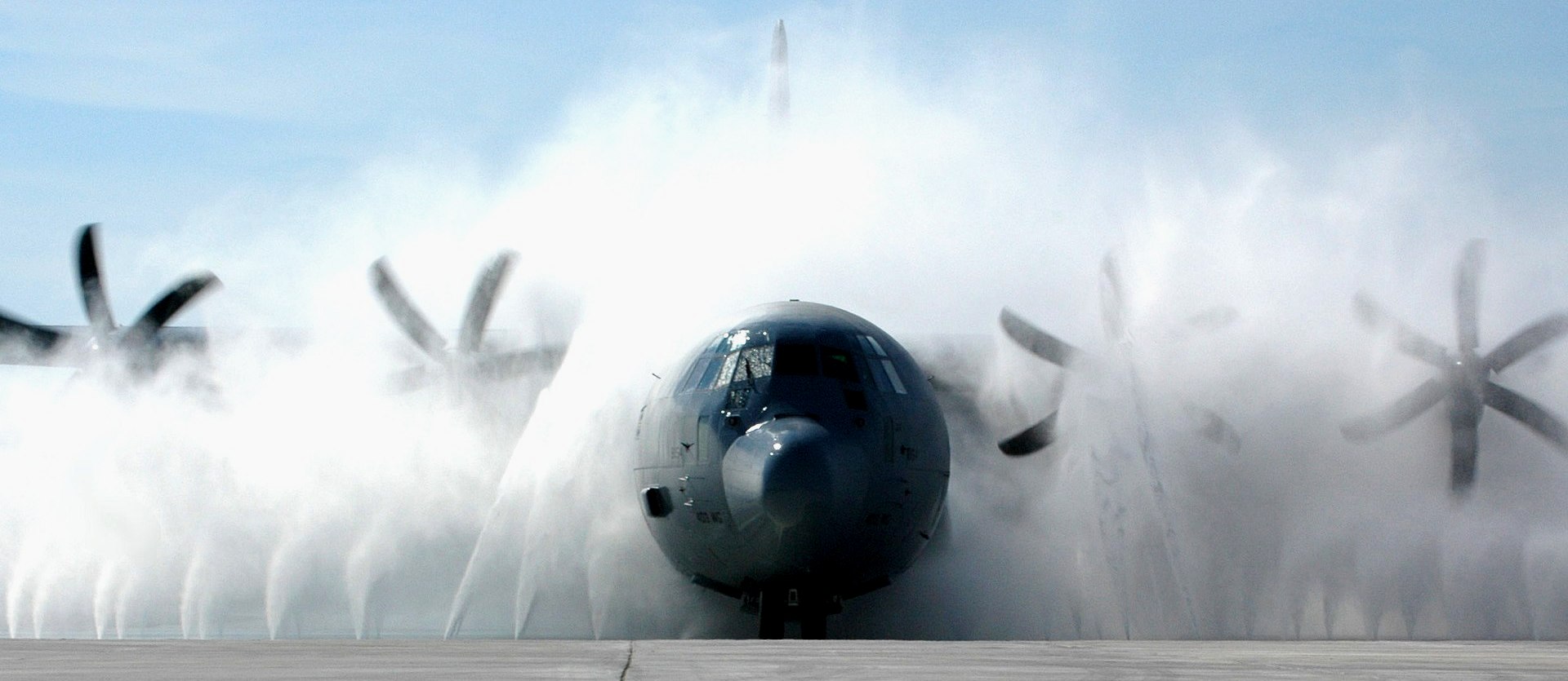 Lockheed C-130J Hercules being cleaned up in a wash system (nicknamed the Bird Bath) at Keesler AFB. The Air Force Reserve Command’s 403rd Wing fly many hours over the Gulf of Mexico. Salt and moisture could lead to corrosion if aircraft are not kept clean.