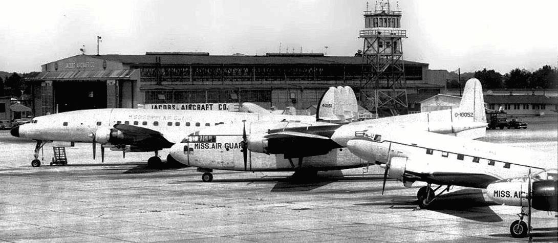 Lockheed C-121 Constellation, Fairchild C-119 Flying Boxcar, Douglas C-47 Skytrain and Douglas RB-26 Invader, 172nd Air Transport Squadron, Mississippi Air National Guard, on the ramp at Hawkins Field, Mississippi, 1961.