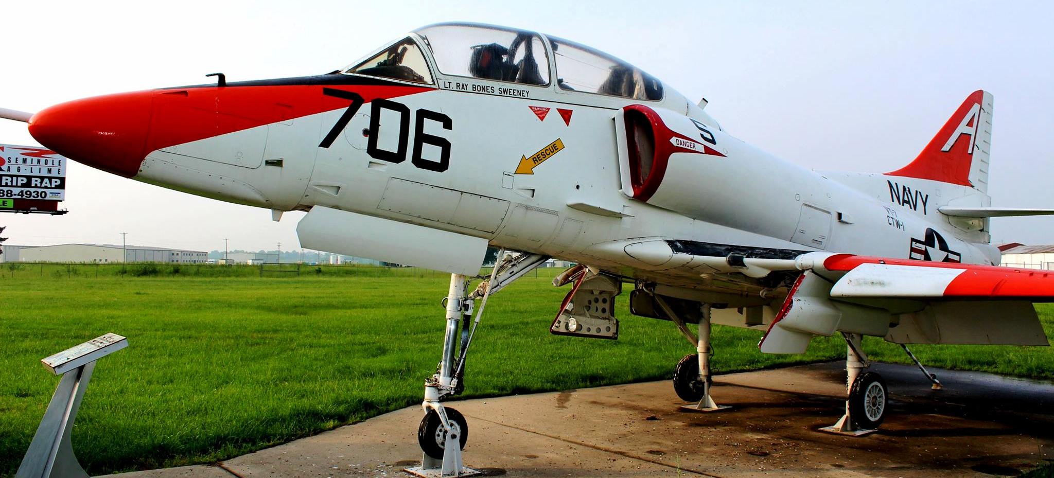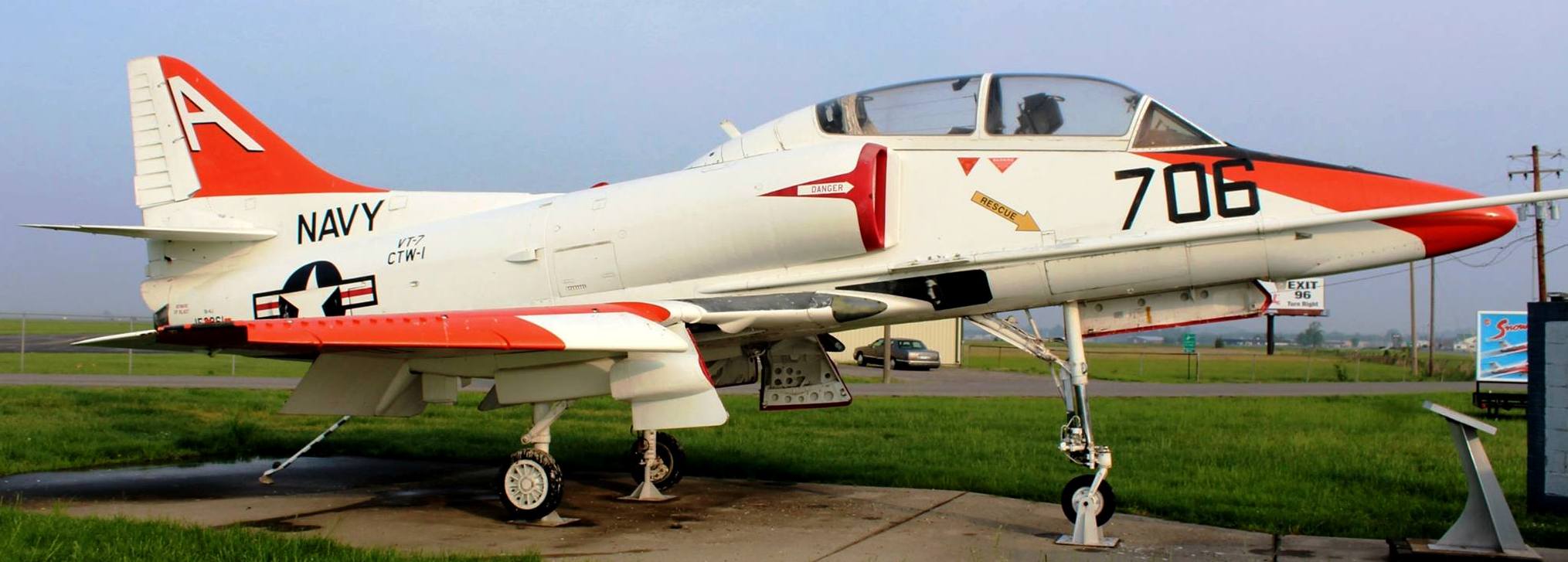 Douglas TA-4J Skyhawk (BuNo. 152861), A-706, C/N 13507, VT-7, CTW-1, mounted on pedestals.  On loan from the NMNA.