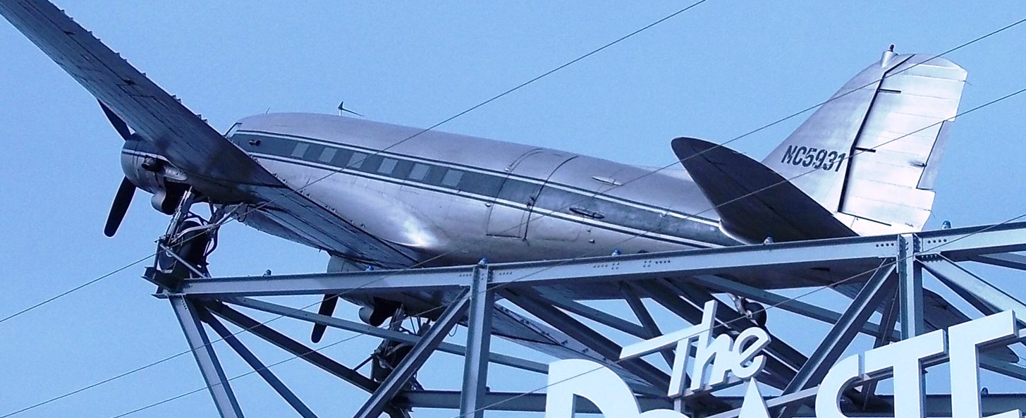 Douglas DC-3 (Serial No.), Reg. No. NC5931), mounted on the roof of the Roasterie – a coffee and tea wholesaler and retailer located at 1204 W. 27th Street.