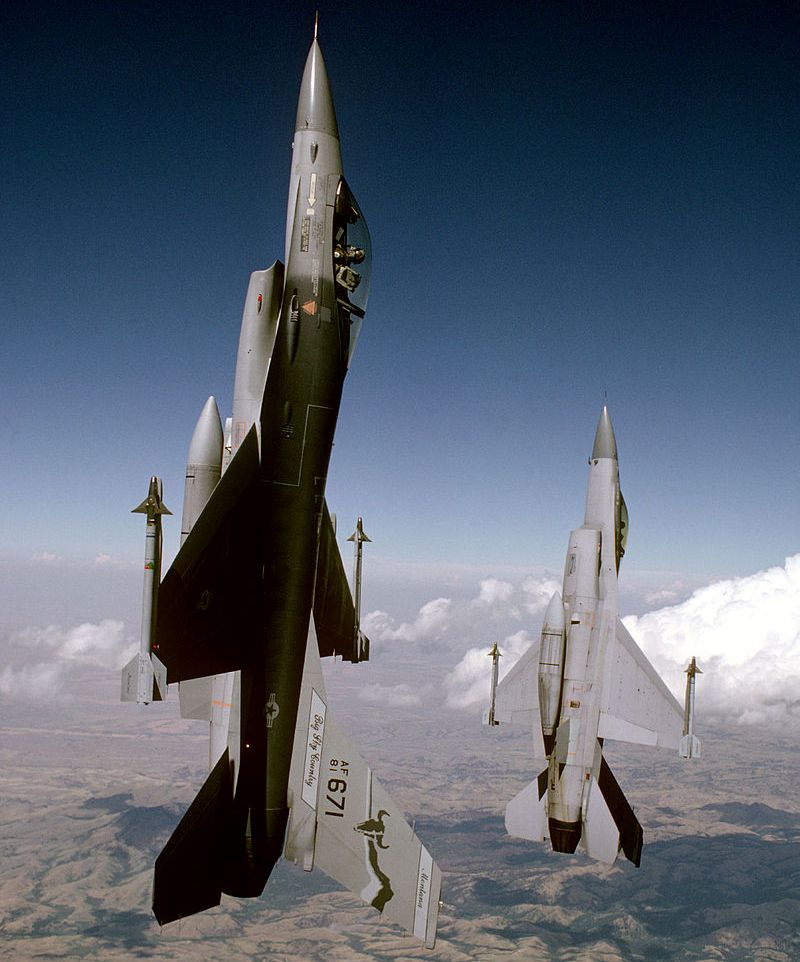 General Dynamics F-16A Fighting Falcon (Serial No. 81-0671), armed with AIM-9 Sidewinder missiles climbing skyward over Great Falls International Airport, Montana.