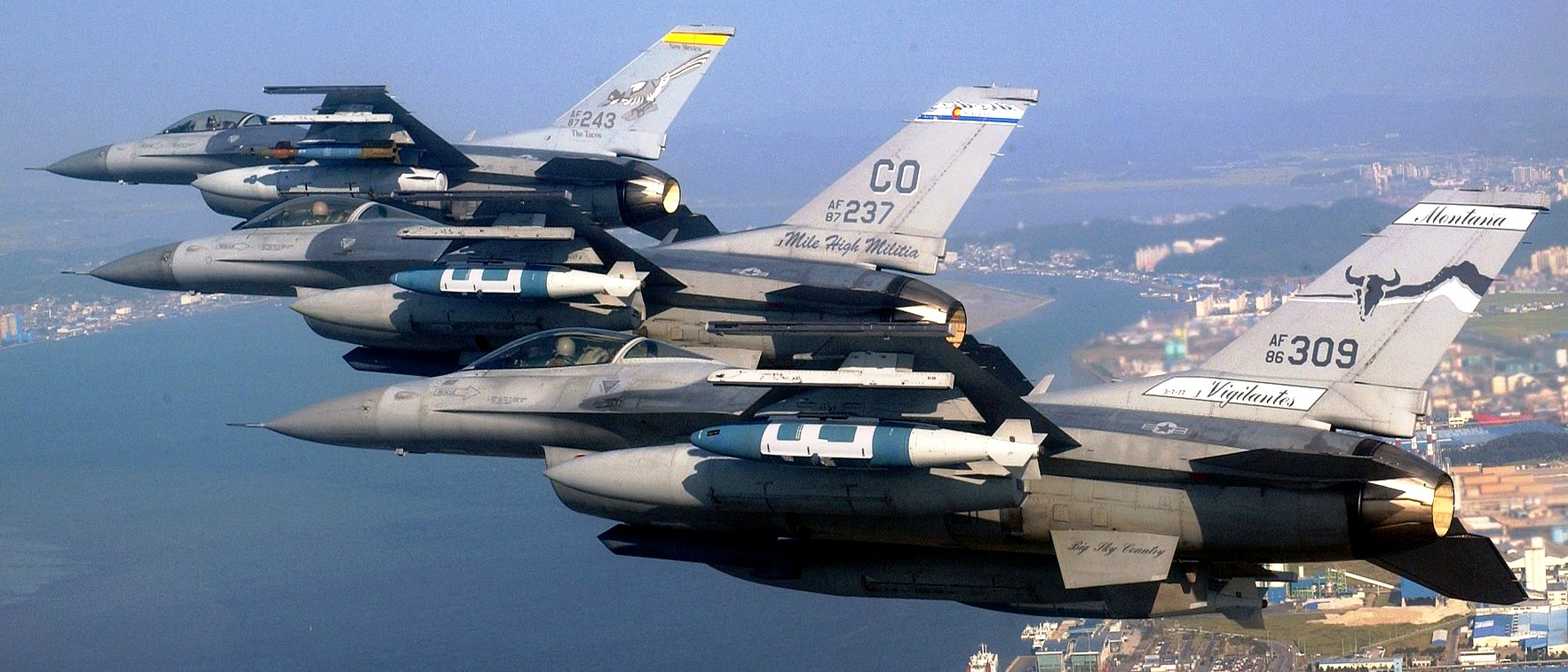 General Dynamics F-16C Fighting Falcon three-ship formation flying over Kunsan City, South Korea. The F-16s serve with Air National Guard units from New Mexico, Colorado and Montana.