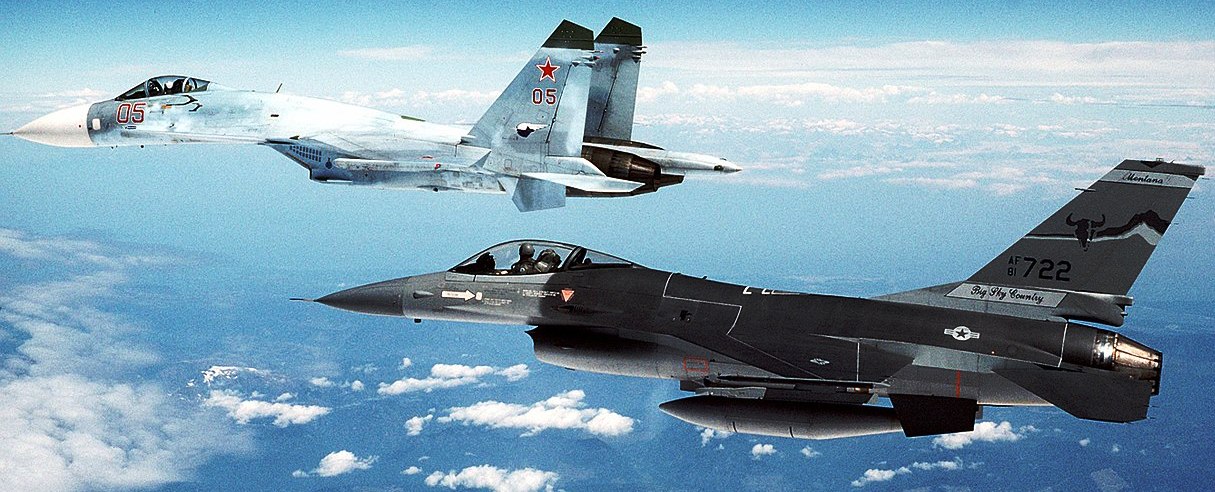 General Dynamics F-16A Fighting Falcon (Serial No. 81-0772) from the 186th Fighter Squadron, Montana Air National Guard, escorts a Soviet Su-27 Flanker aircraft to the Canadian border after an air show, 1990.